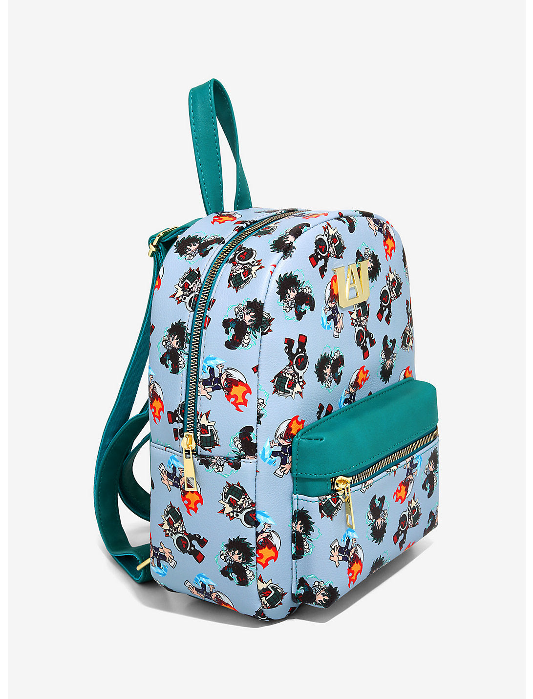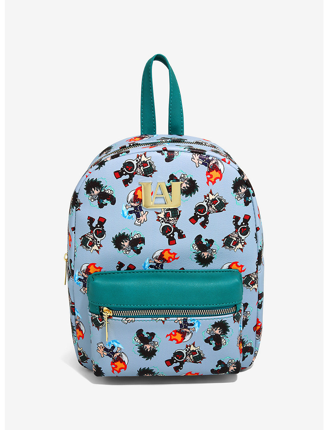 ¿Listo para un poco de ternura Plus Ultra? Esta mini mochila de piel sintética presenta un estampado integral de chibi Deku, Todoroki y Bakugo. Hay un adorno de metal de la U.A. Logotipo alto en la parte delantera. Correas ajustables, bolsillo frontal con cremallera y bolsillo interior abatible.