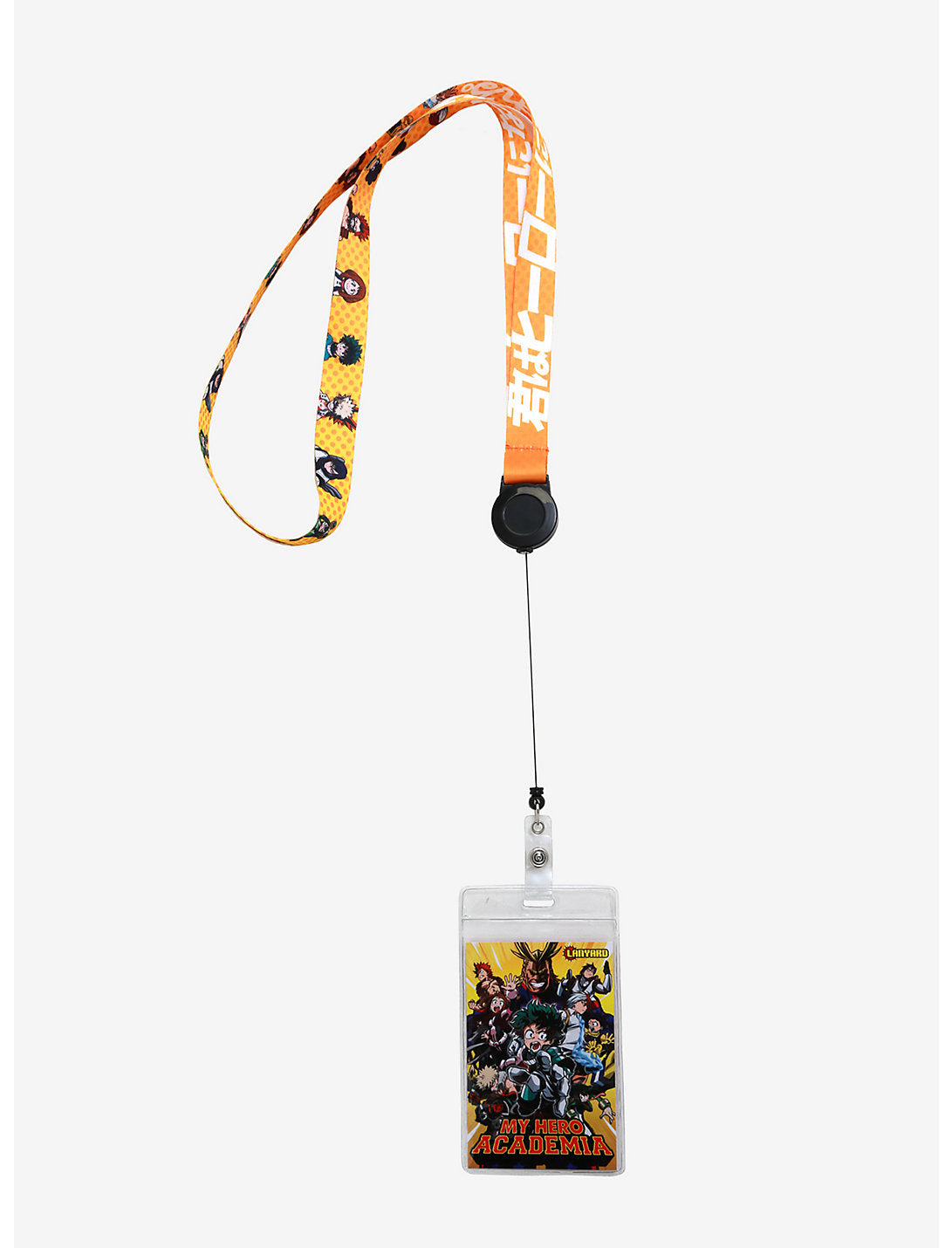 ¡No pierda su tarjeta de identificación Clase 1-A! Guárdelo en este cordón de My Hero Academia con soporte de identificación retráctil. El cordón amarillo está impreso con tus héroes estudiantiles favoritos y texto en japonés en blanco.