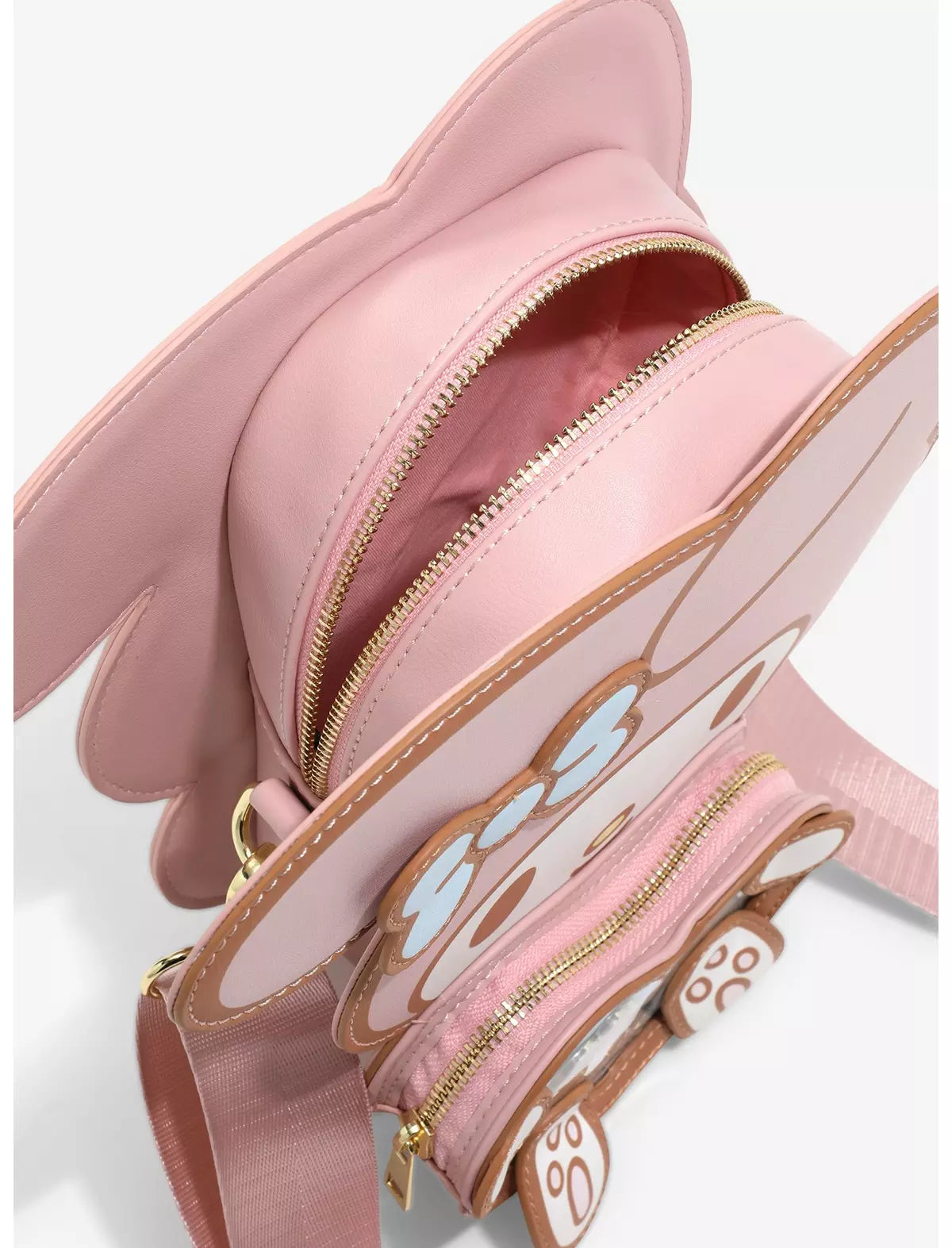 ¡My Melody alegra tu outfit con esta bandolera! Este bolso figurativo se parece al adorable conejo que sostiene un corazón aplicado entre sus patas. La ventana de plástico transparente se cierra con un adorable pasador removible, ¡y no olvides la correa cruzada removible para mayor comodidad!