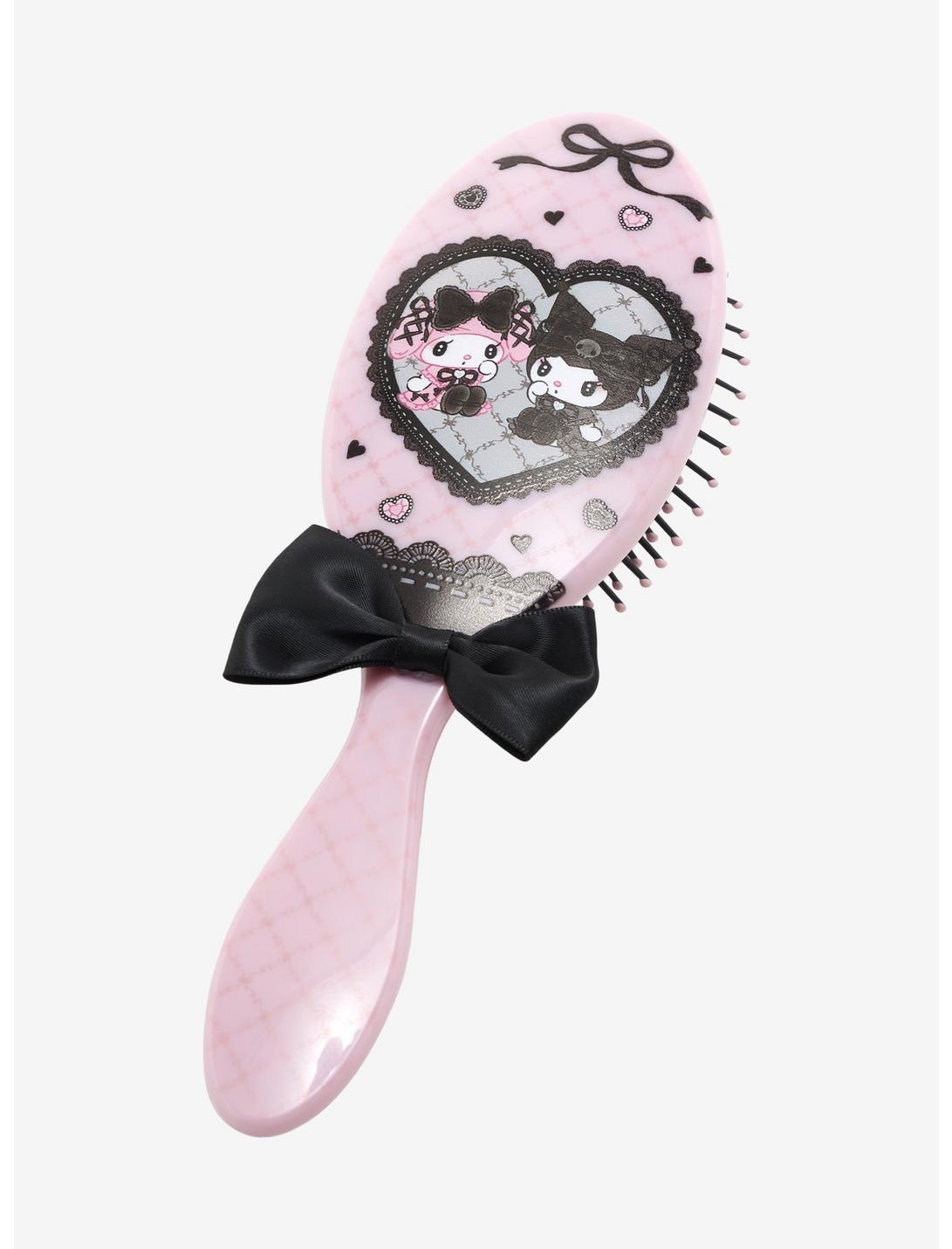 ¡Mantén tu peinado con un aspecto atractivo con este cepillo para el cabello de Sanrio! ¡Presenta un adorable diseño de My Melody y Kuromi en un corazón de encaje, vestidos con trajes inspirados en Lolita! Viene con un lazo de satén negro en el mango.