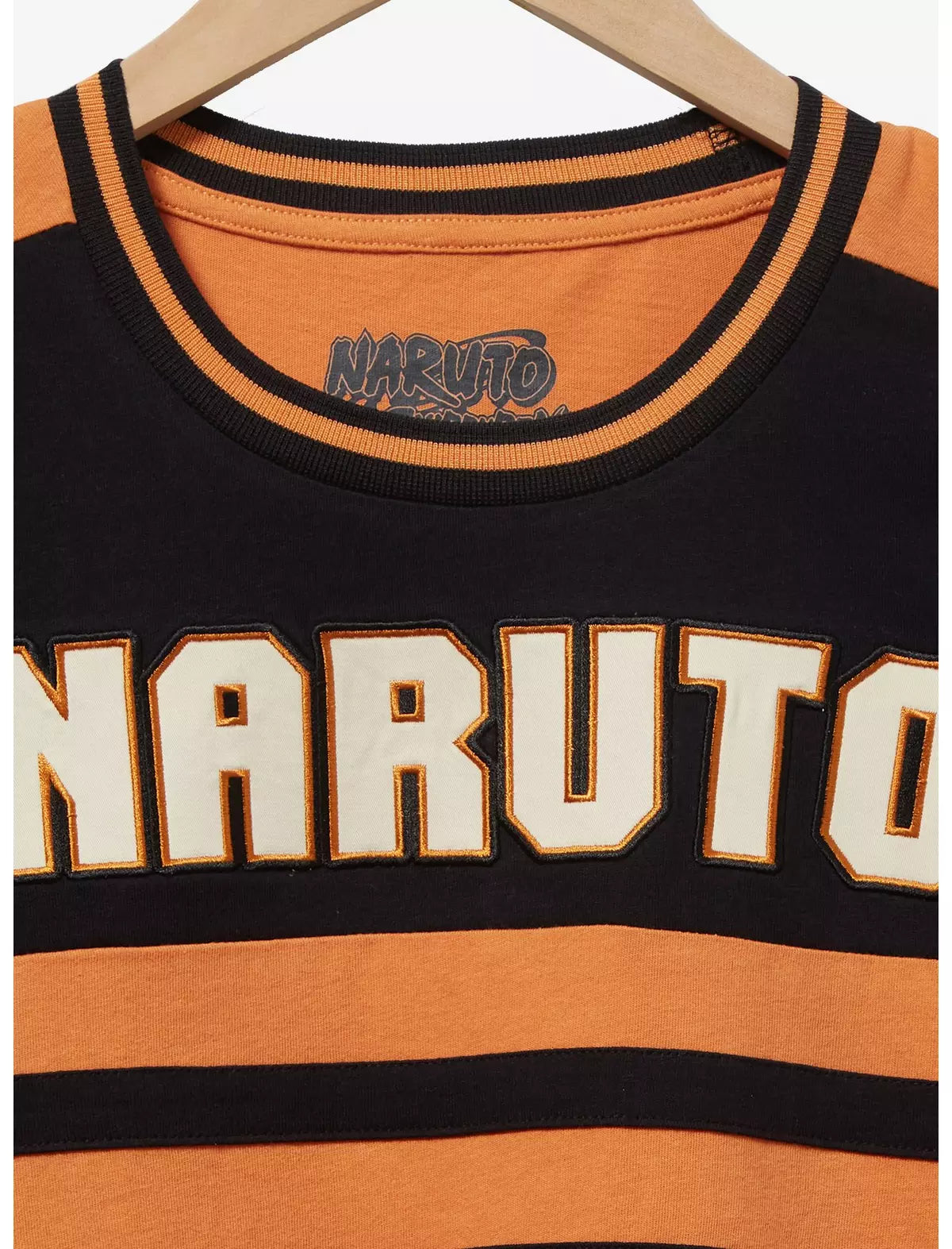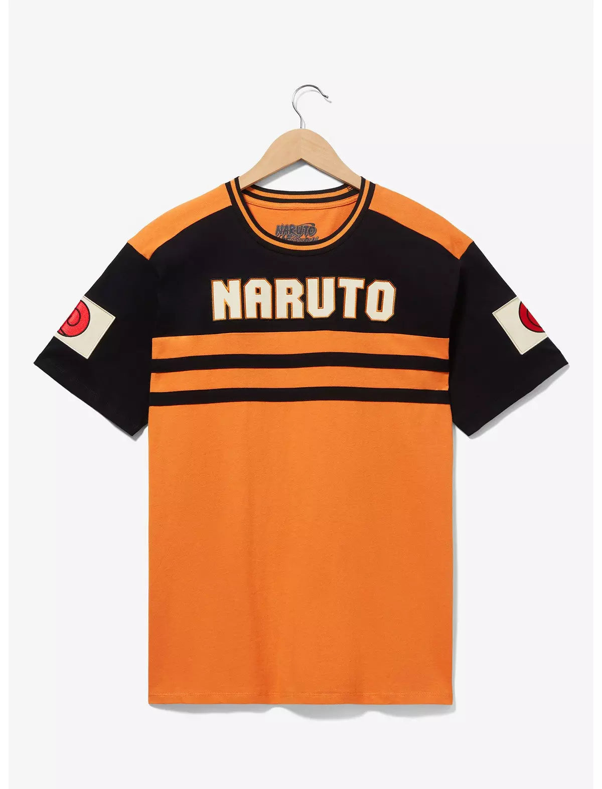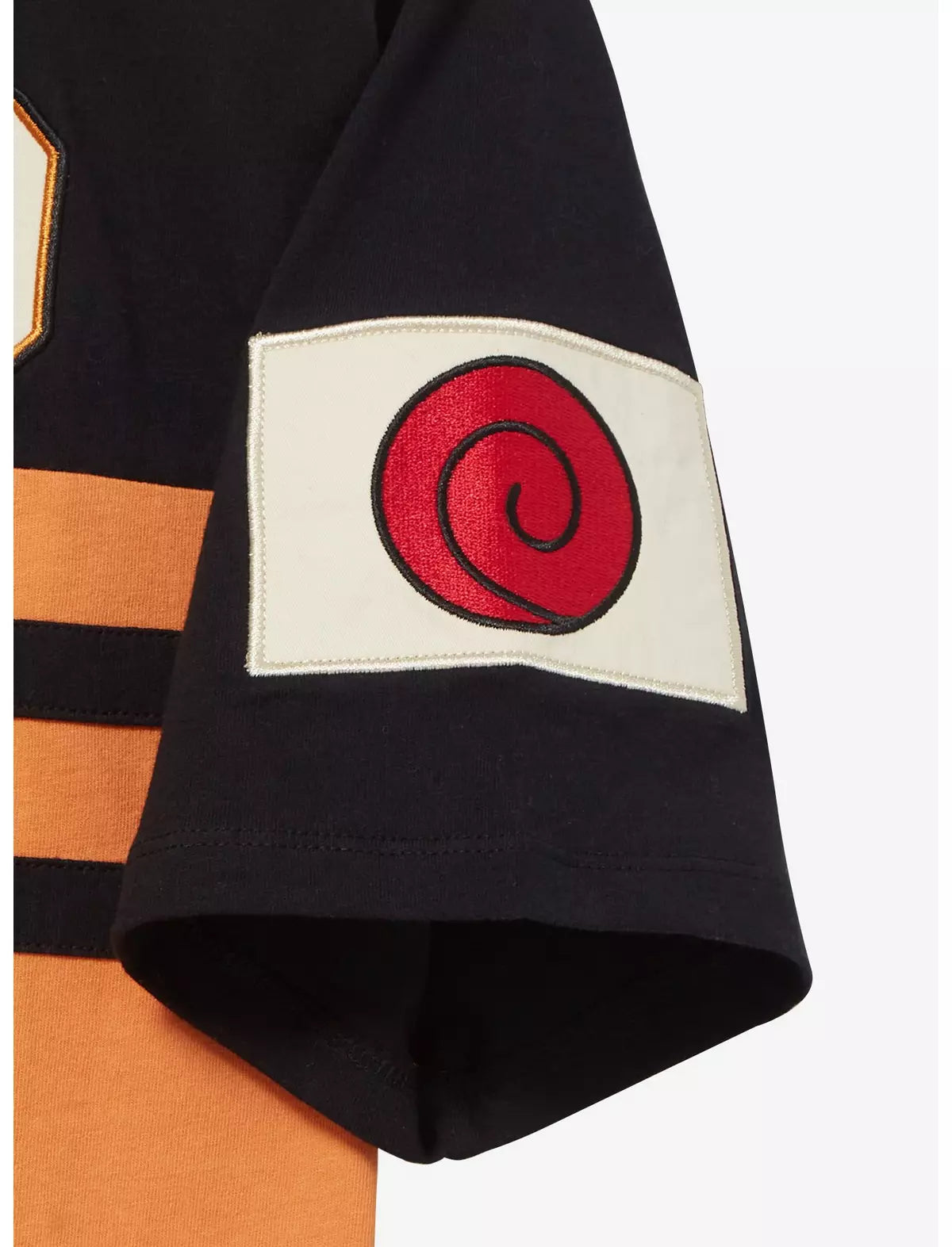¡Vístete al estilo shinobi con esta camiseta inspirada en Naruto Shippuden! Con una parte superior con bloques de color, esta camiseta incluye letras de parche "Naruto" en el frente y parches bordados del clan Uzumaki en las mangas, esta camiseta es perfecta para los fanáticos del anime.