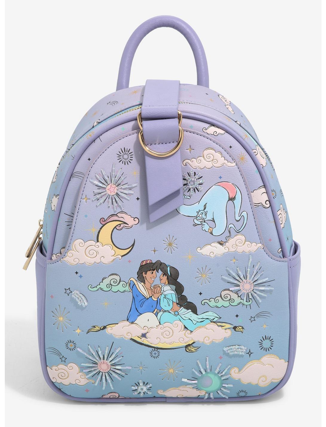 - ¡Ya seas una rata callejera o realeza, puedes llevar todas tus pertenencias al estilo clásico de Disney con esta minimochila Aladdin de Our Universe! Inspirado en la querida película animada, este bolso presenta un lienzo colorido que representa una escena mágica en el cielo con detalles de cuentas. Con un gráfico grabado en el frente de Aladdin compartiendo un amoroso abrazo con Jasmine sobre su alfombra mágica, mientras Genie vuela alto en el fondo. Cuenta con herrajes dorados, una insignia esmaltada de la marca, dos bolsillos laterales, un bolsillo delantero con cierre de botón a presión, correas ajustables para los hombros y un patrón de forro interior de cielo nocturno.