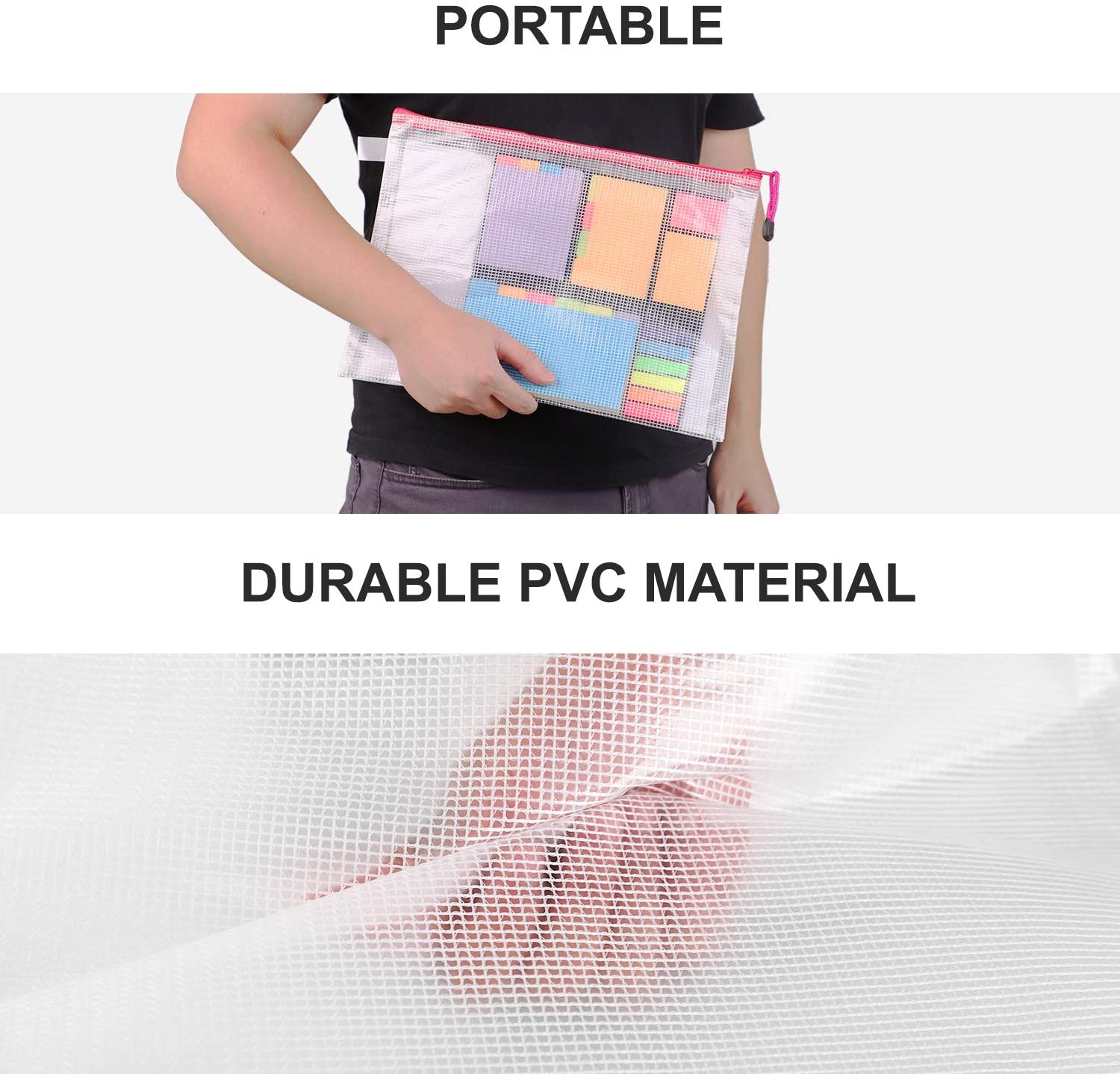 - Material duradero: hecho de PVC de malla resistente y material de cierre de metal, las bolsas con cierre durarán mucho tiempo