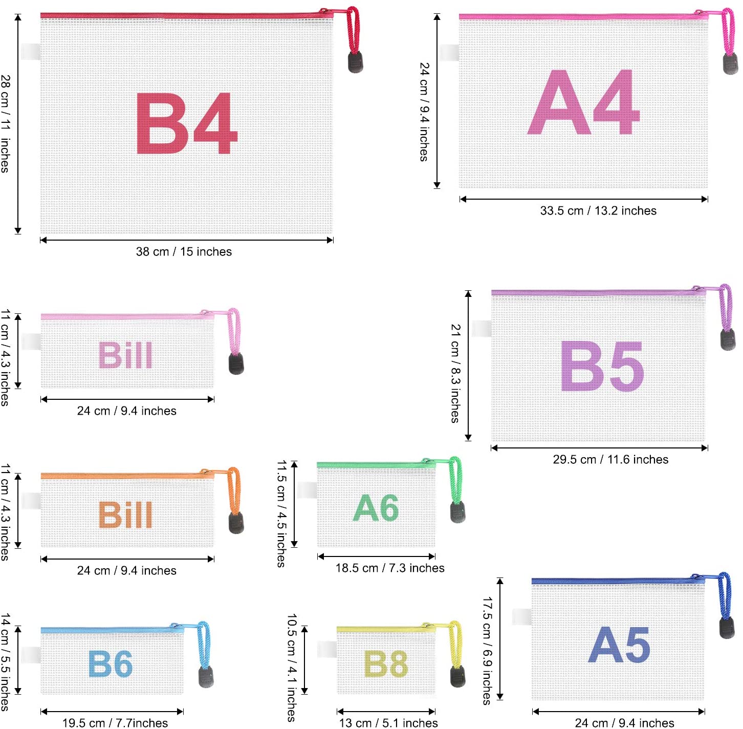 - 18 bolsas con cierre: el paquete incluye 18 bolsas de malla con cierre en 8 tamaños Son 2 x B4 (38,1 x 27,9 cm), 2 x A4 (33,5 x 23,8 cm), 2 x B5 (29,4 x 21 cm), 2 x A5 (23,8 x 17,5 cm), 2 x B6 (19,5 x 13,9 cm). 2*A6 (18,5 ×11,4), 4 billetes. (23,8 x 10,9 cm), 2 x B8 (12,9 x 10,4 cm)