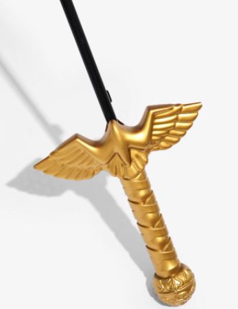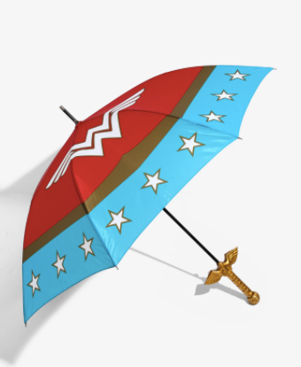 - Este paraguas tiene un mango de oro moldeado y el logotipo y las estrellas de Wonder Woman. Guardado en una funda con una correa ajustable.