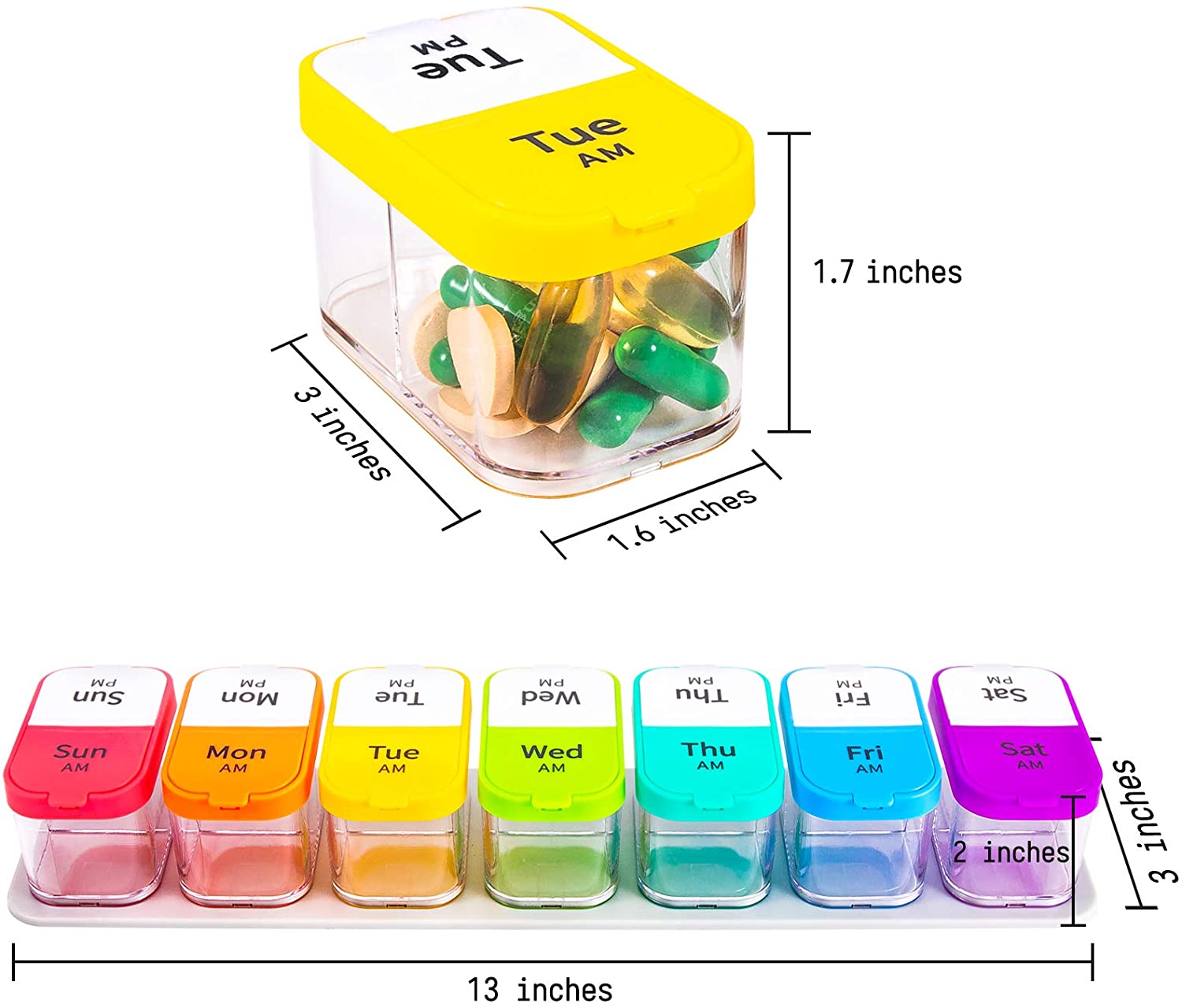 - Organizador de pastillas extragrande de excelente impresión: la impresión ha pasado la prueba crítica de adhesivos y cintas 3M, no se borra más de 5000 veces de uso. Con un gran espacio de 1.7 x 1.6 x 3.0 in para cada compartimento, el organizador semanal de pastillas dos veces al día es perfecto para quienes necesitan un organizador de pastillas extra grande para adaptarse a todos los medicamentos y vitaminas