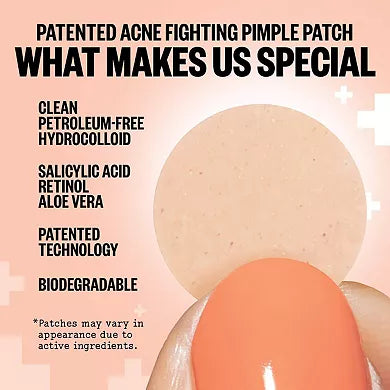 El único parche para acné patentado que combina tecnología de polímero hidrocoloide limpia con activos específicos para reducir la apariencia de los granos durante la noche.