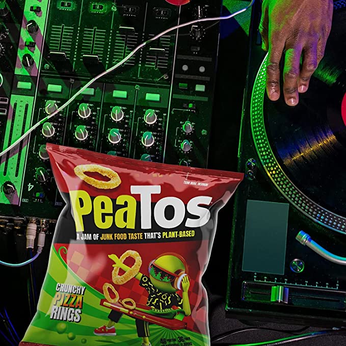 LA COMIDA CHATARRA SABE Y ES MEJOR PARA USTED... ESPERE ¿QUÉ?—¡Los aros de pizza de PeaTos son más ricos en PROTEÍNAS Y FIBRA y BAJOS EN CALORÍAS! ¡PeaTos también no contiene OGM y está CERTIFICADO SIN GLUTEN!