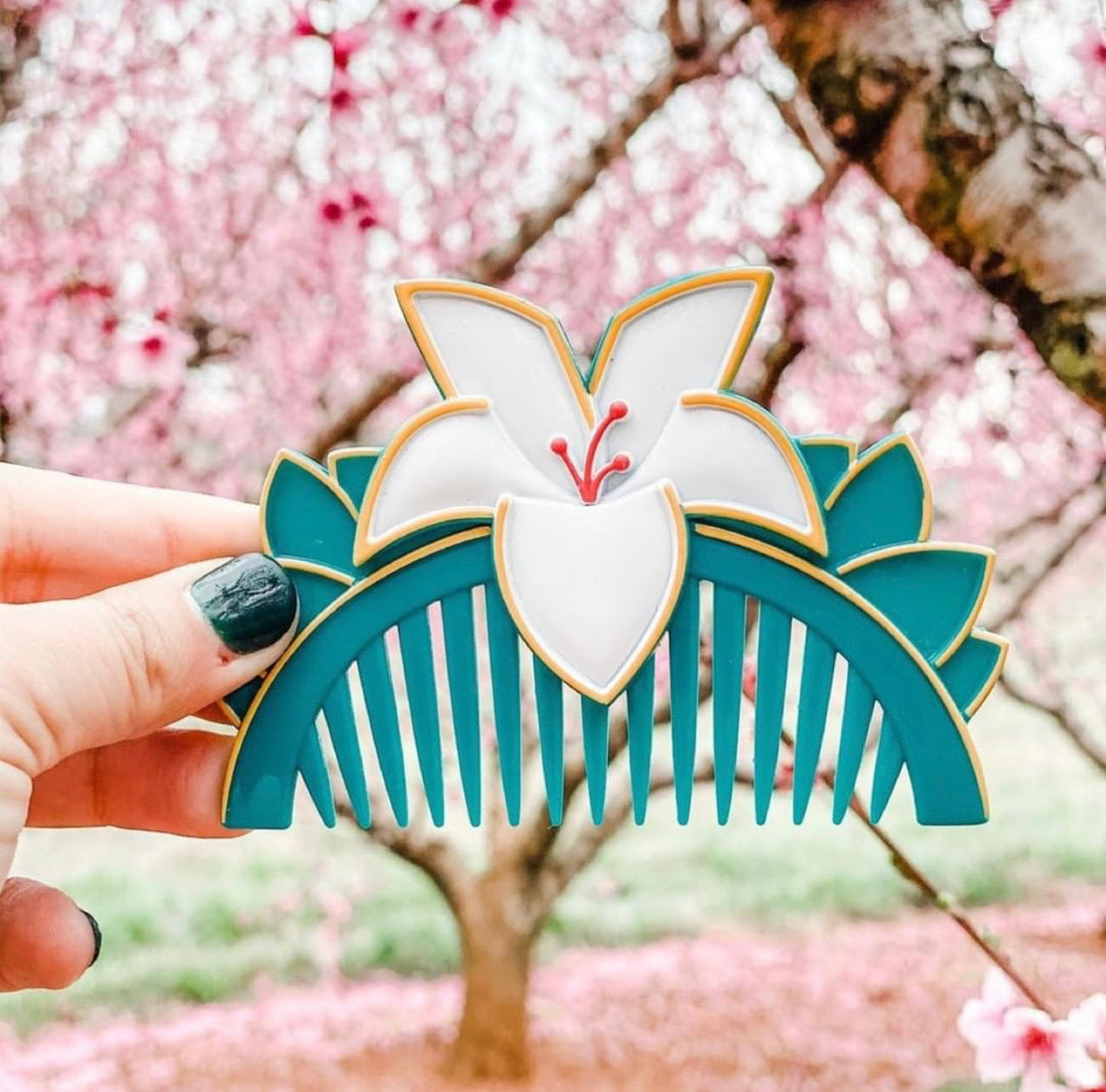 Deja que tu flor interior florezca y canalice la fuerza y la belleza de Mulan con este peine de plástico para el cabello que es una réplica del peine usado por Mulan en el clásico de Disney.