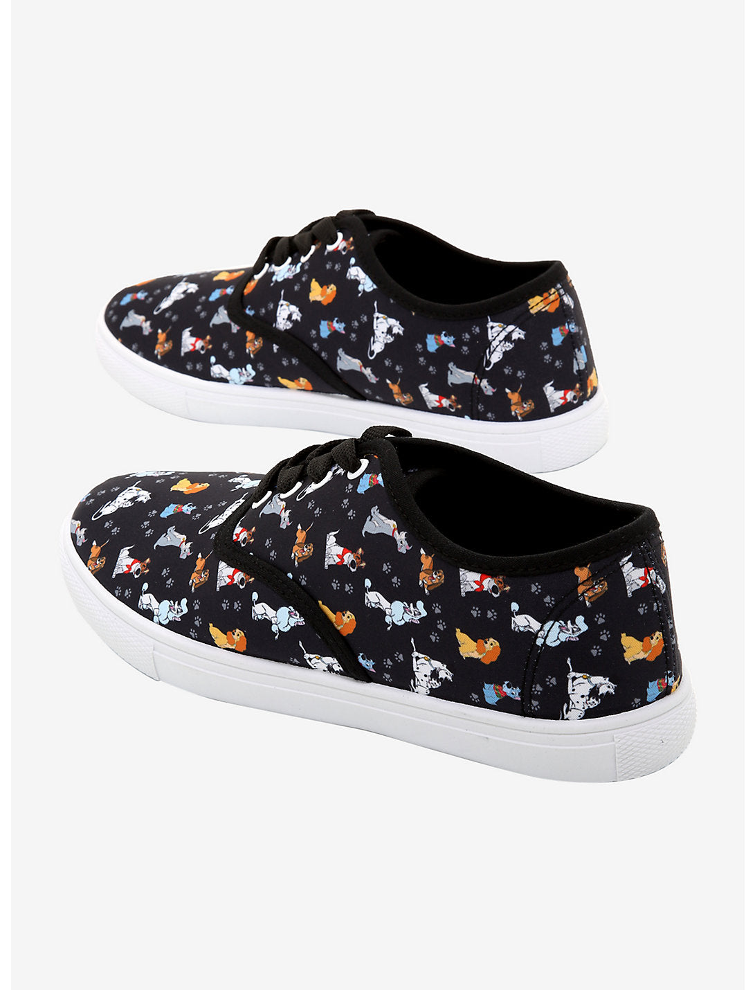 ¿Quieres dar un paseo con tus perros favoritos de Disney? ¡Tenemos los zapatos perfectos para eso! Estas zapatillas negras con cordones están estampadas con huellas de patas y perros de La dama y el vagabundo, 101 Dálmatas y más. Con suela blanca y cordones negros.