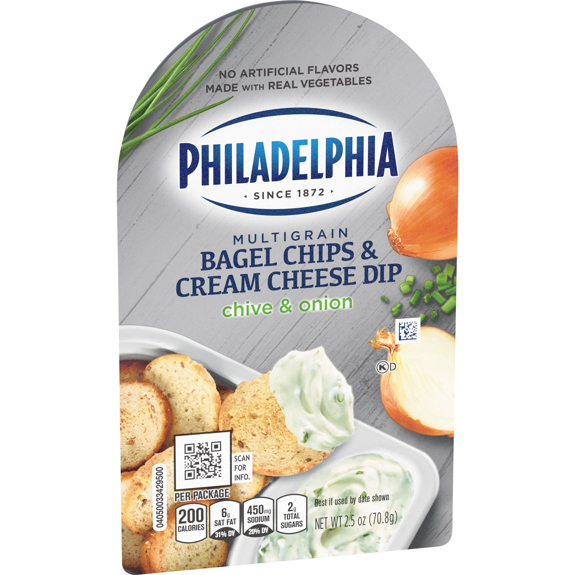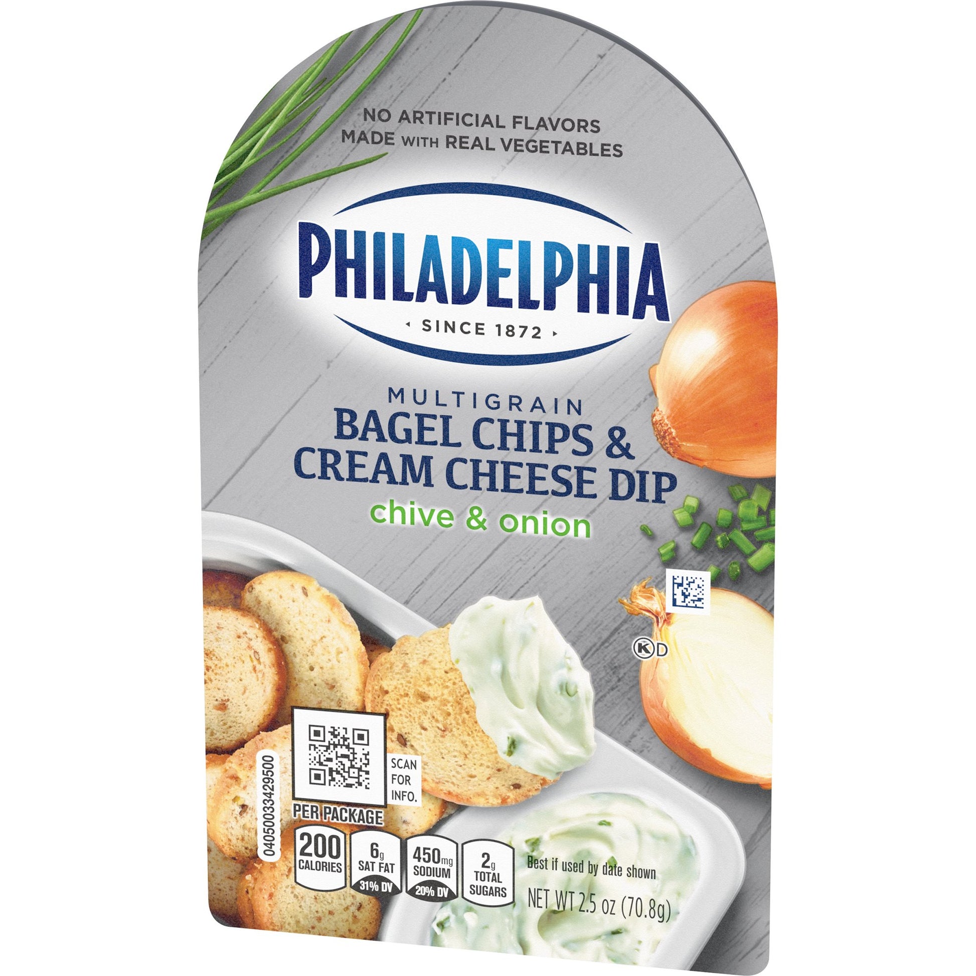 Una bandeja de 2.5 oz de chips Philadelphia Bagel & Dip de queso crema con cebollino y cebolla