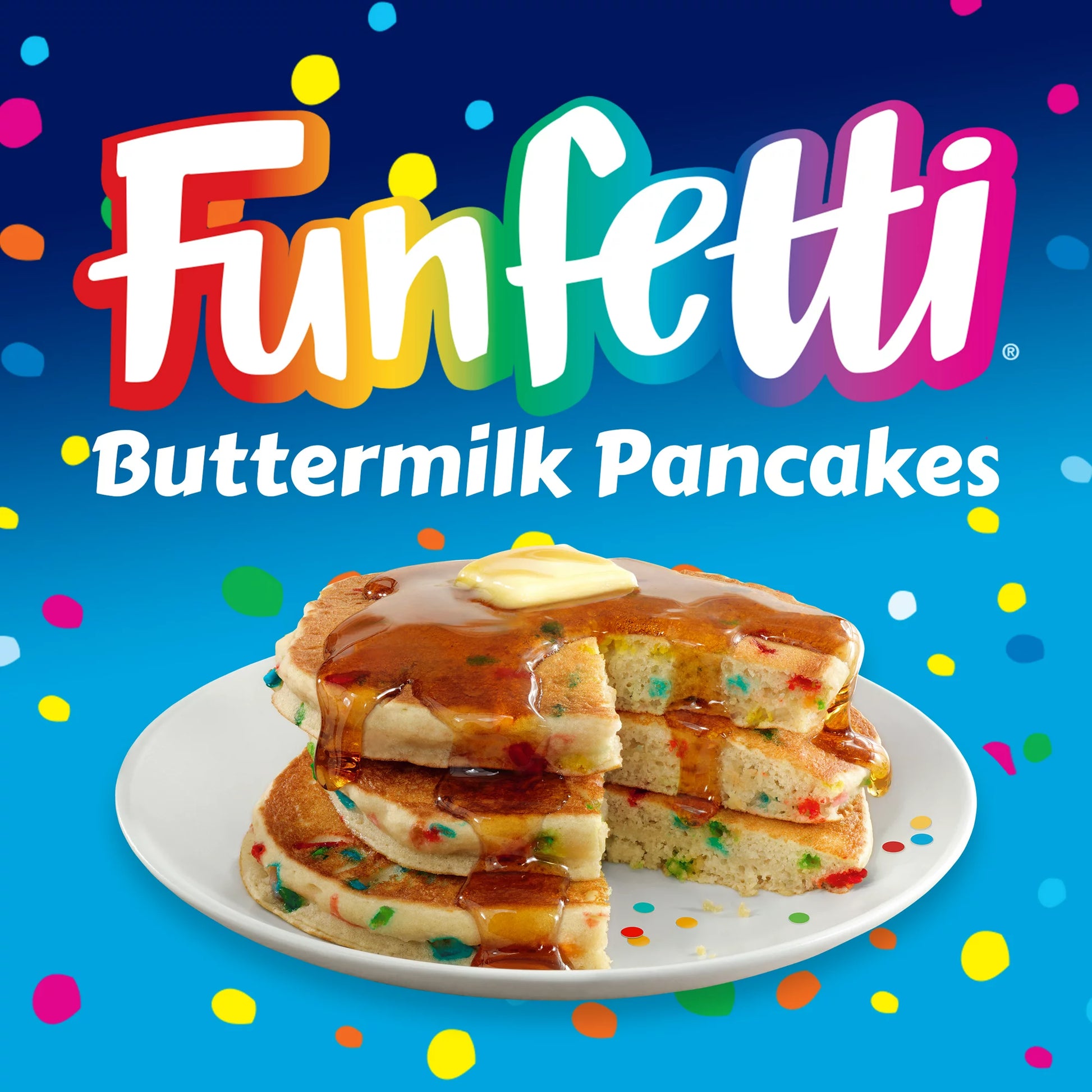 Reúne el delicioso sabor de los panqueques clásicos de suero de leche y la diversión de Funfetti en una mezcla completa para panqueques