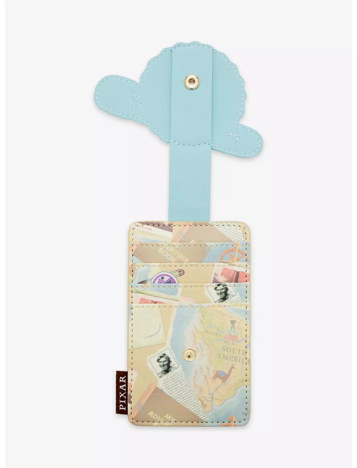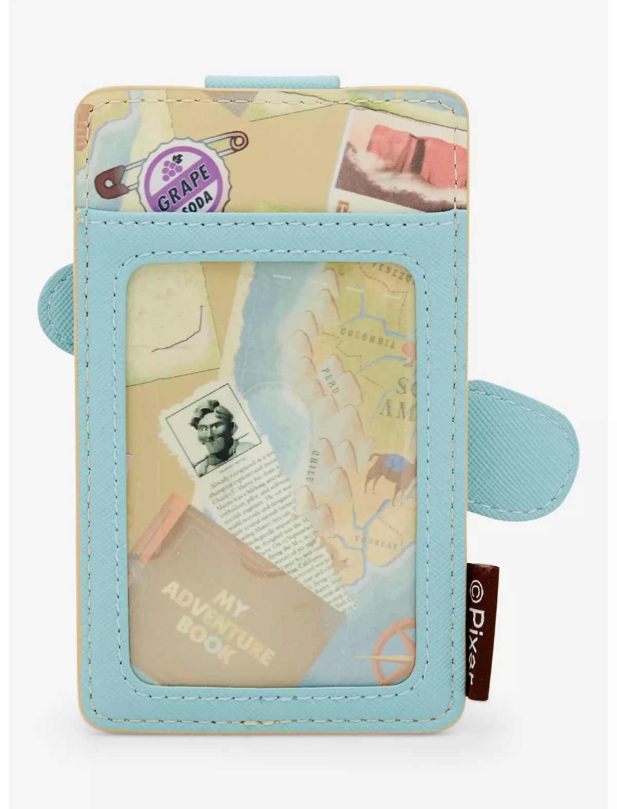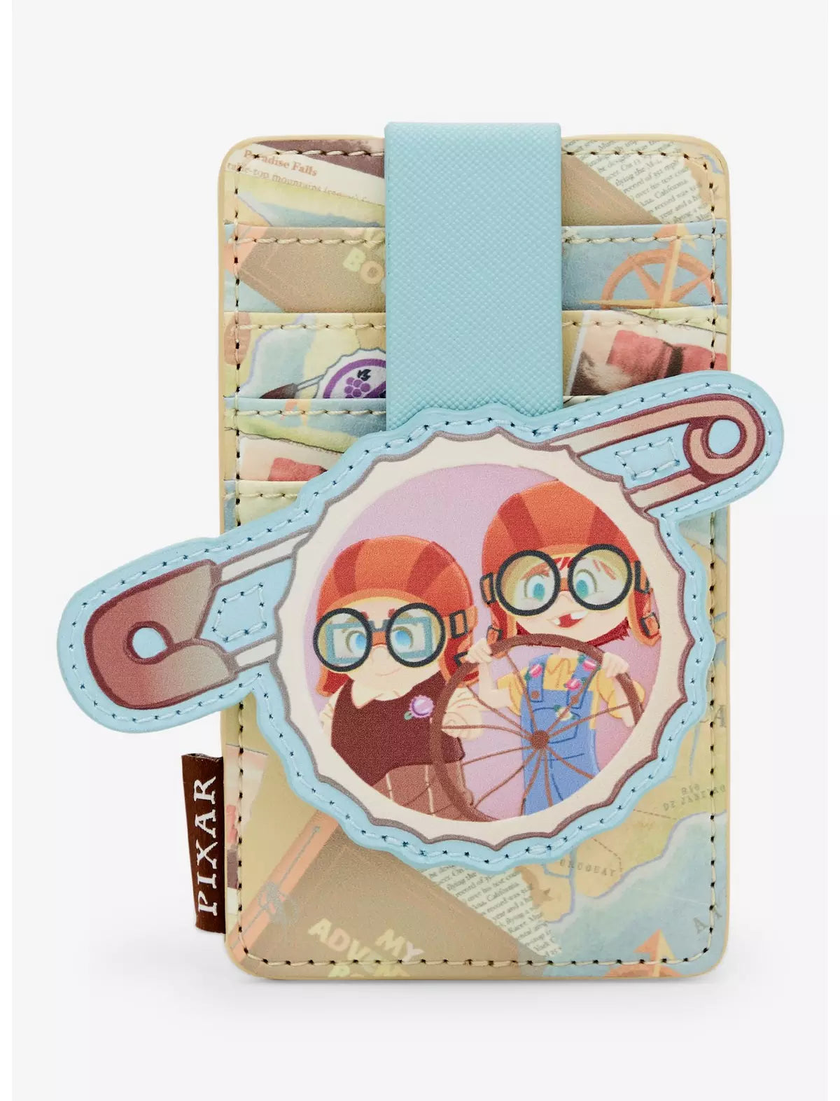 ¡Mantén seguros tus elementos esenciales de aventuras con este tarjetero inspirado en Up! Con un estampado integral de mapas y pines de refresco de uva, el frente de este tarjetero incluye un cierre a presión con un aplique de los jóvenes Carl y Ellie. Con cuatro ranuras para tarjetas y una funda transparente para identificación, este accesorio es perfecto para tu próximo viaje a los Parques Disney y más allá.
