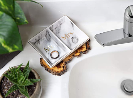 - La bandeja se adapta a más joyas: a diferencia de otras bandejas de joyería de Mr. & Mrs. que son apenas lo suficientemente grandes como para contener dos anillos, nuestra hermosa bandeja cuenta con un espacio más grande para platos (5.4 pulgadas de ancho x 0.7 pulgadas de alto x 4.2 pulgadas de profundidad) para que puedas sostener más anillos, pendientes, pulseras, collares e incluso llaves o el reloj de Mr. Es el tamaño perfecto para parejas que quieren mantener múltiples piezas de joyería seguras antes de saltar en la ducha o ir a la cama.