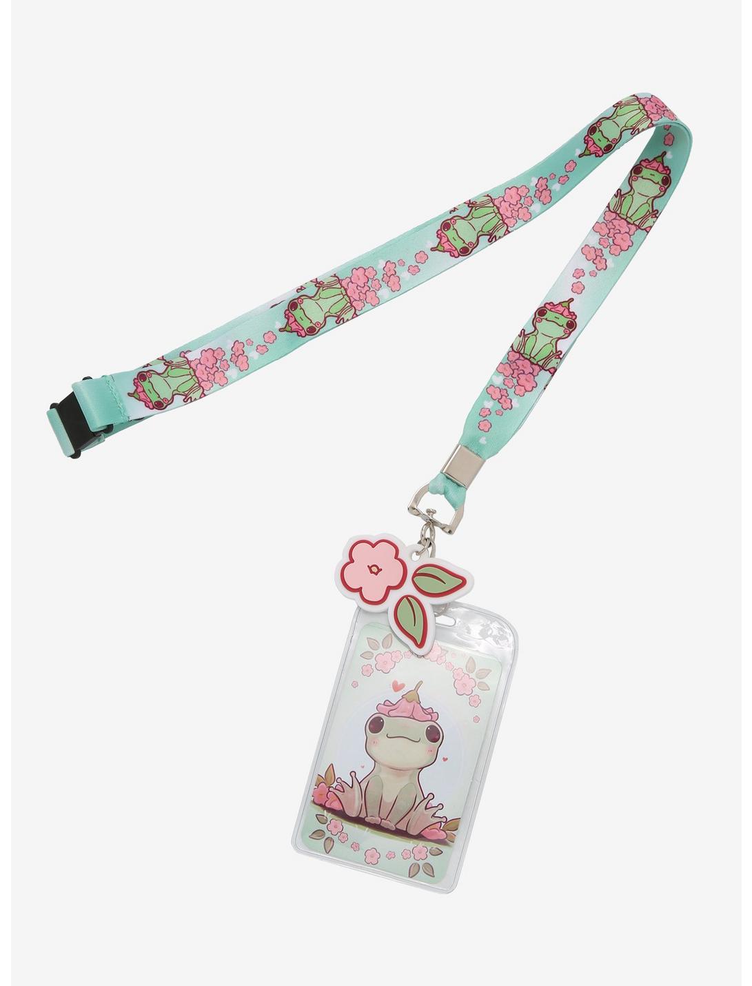 ¿Buscas un nuevo y dulce cordón para tus artículos esenciales? ¡Súbete a este ahora mismo! Este cordón verde azulado presenta un estampado repetido de una adorable rana rodeada de flores rosadas, y viene con un dije de flor, una bolsa de identificación transparente y una hebilla de seguridad en el cuello.