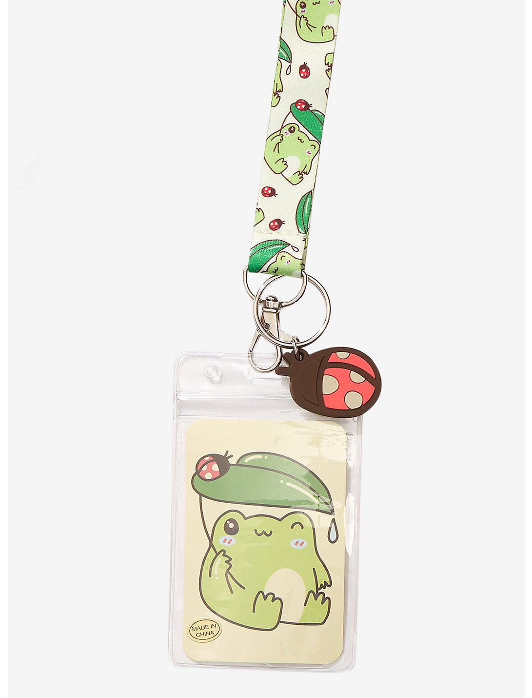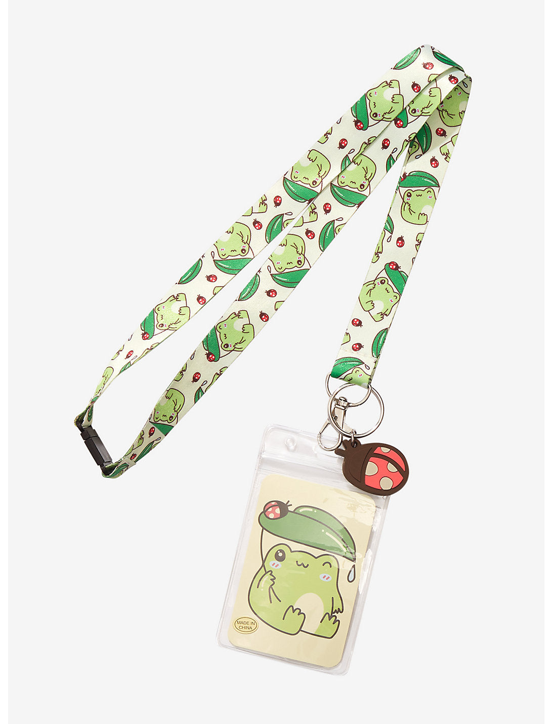 ¡Un poco de lluvia no derribará a esta monada! Este cordón verde presenta un estampado completo de una rana kawaii sosteniendo un paraguas de hojas, con una pequeña mariquita encima.