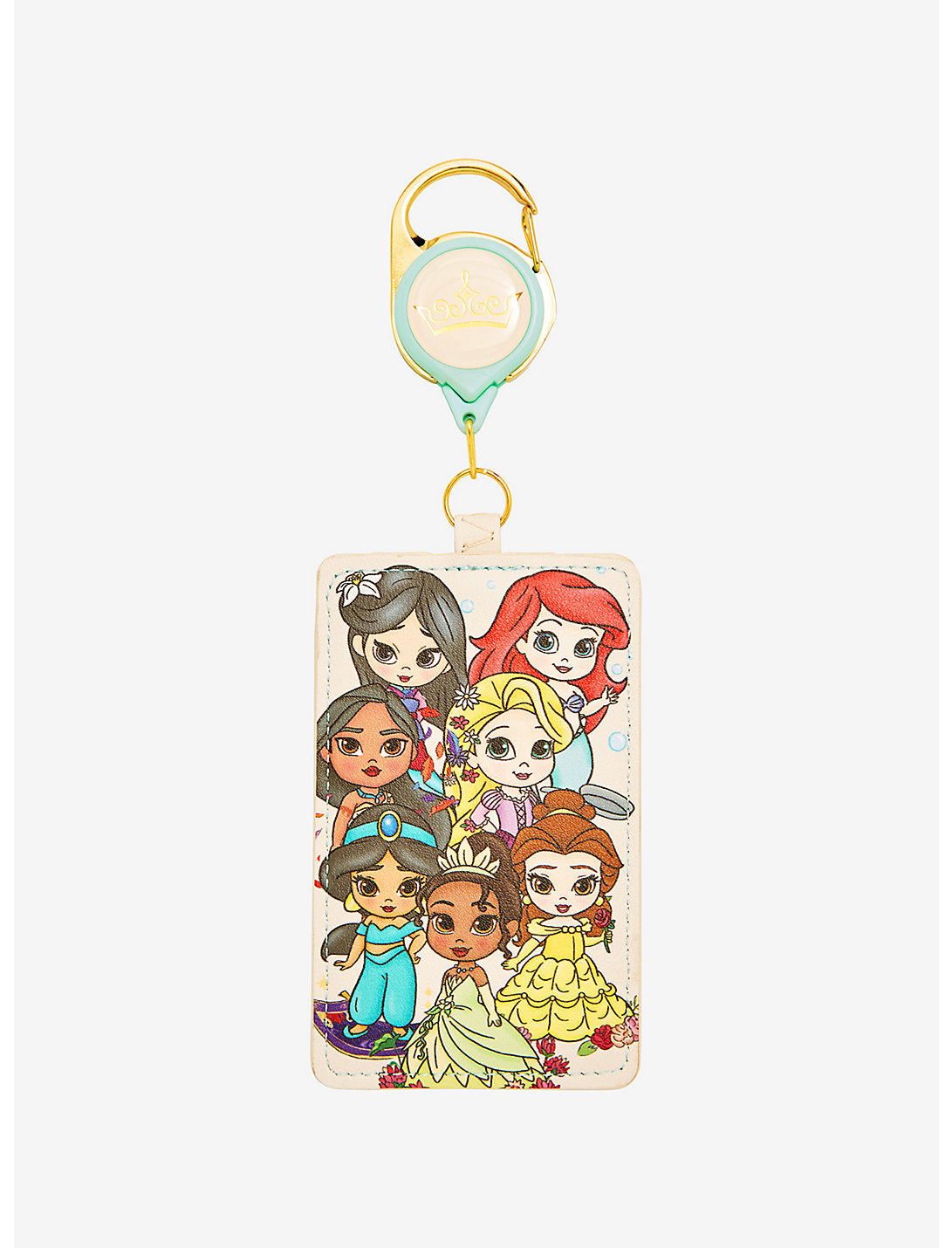 ¡Lleva tu identificación con este estilo realmente adorable! Con arte chibi de las princesas de Disney Mulan, Ariel, Pocahontas, Rapunzel, Jasmine, Tiana y Belle, este cordón retráctil Loungefly agrega el toque perfecto de la realeza de Disney a su bolso o llavero. También cuenta con un patrón estampado de las princesas detrás de la funda de identificación transparente y un broche de langosta en tono dorado completo con un logotipo de corona para facilitar la colocación.