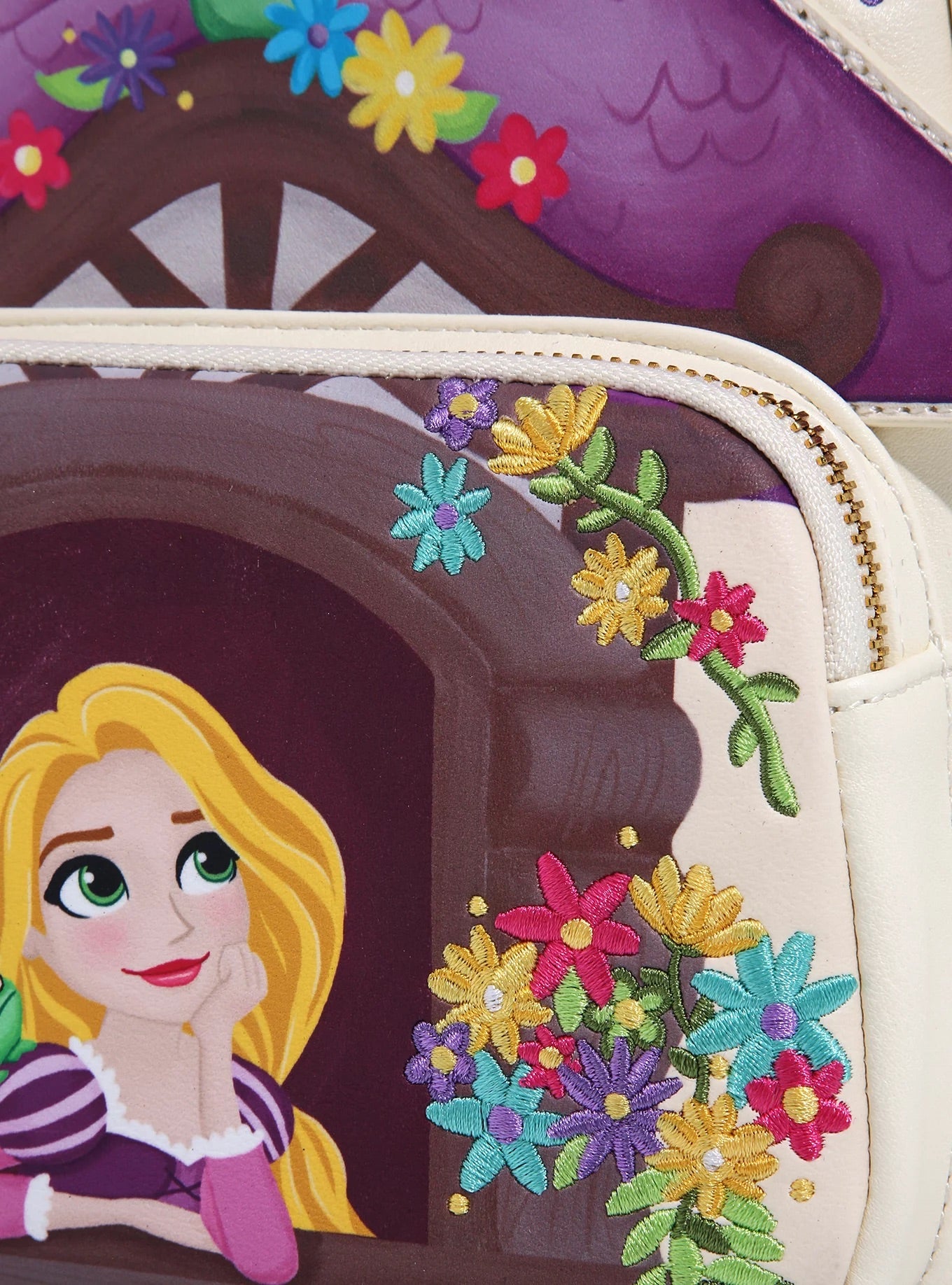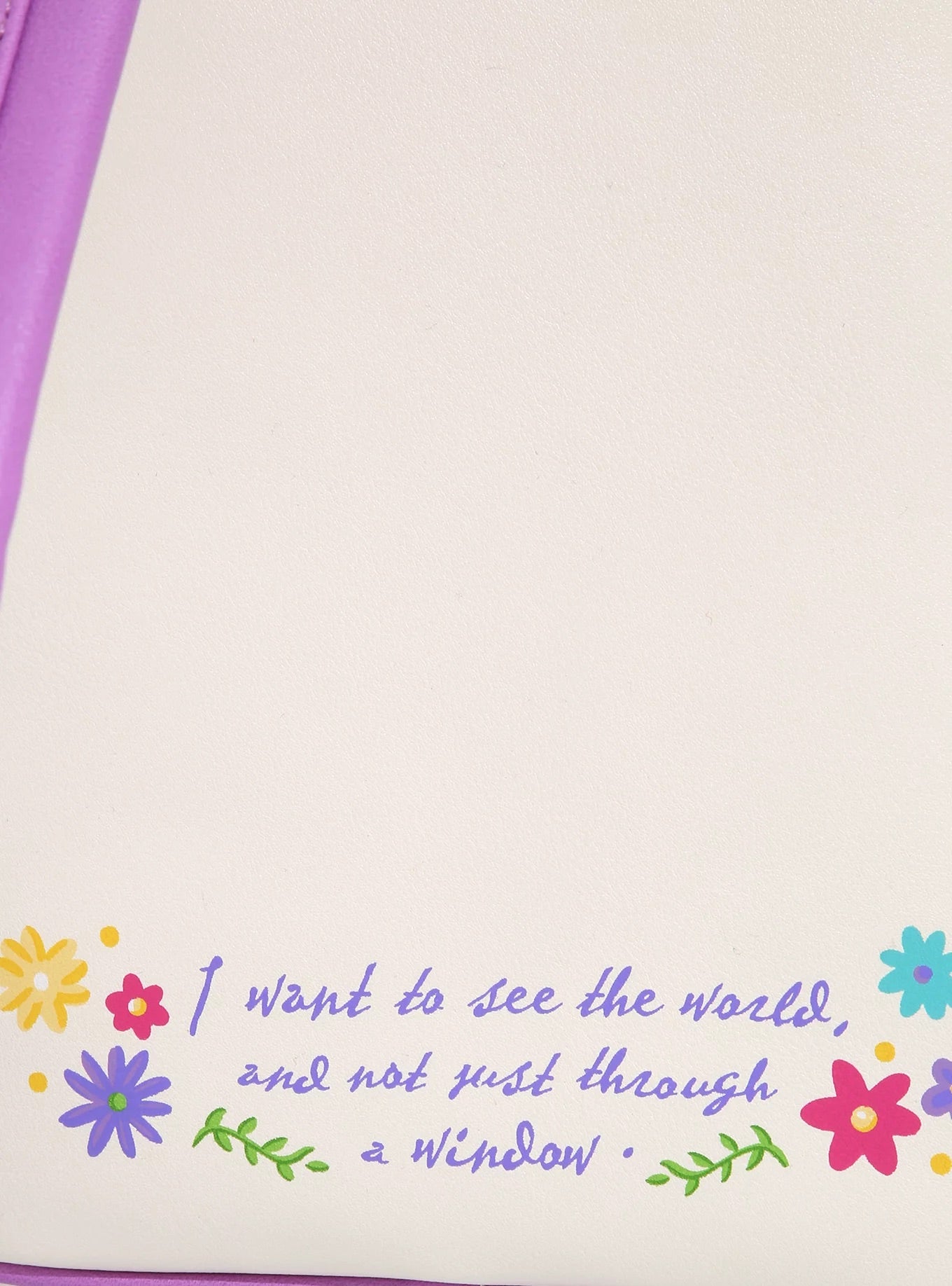 Rapúnzel mira con nostalgia el mundo del más allá. ¿Por qué no traerla y mostrarle lo que hay ahí fuera? ¡Celebra los 10 años de Tangled con esta mini mochila Loungefly de piel sintética de ensueño! La princesa de Disney y su compañero Pascal se asoman desde la ventana de la torre, rodeados de flores silvestres bordadas y detalles gráficos. En la parte posterior hay una cita de la película: "Quiero ver el mundo, y no solo a través de una ventana". Los detalles adicionales incluyen bolsillos frontales y laterales, correas ajustables, herrajes en tono dorado y forro interior con un patrón especial de aniversario. Aprox.