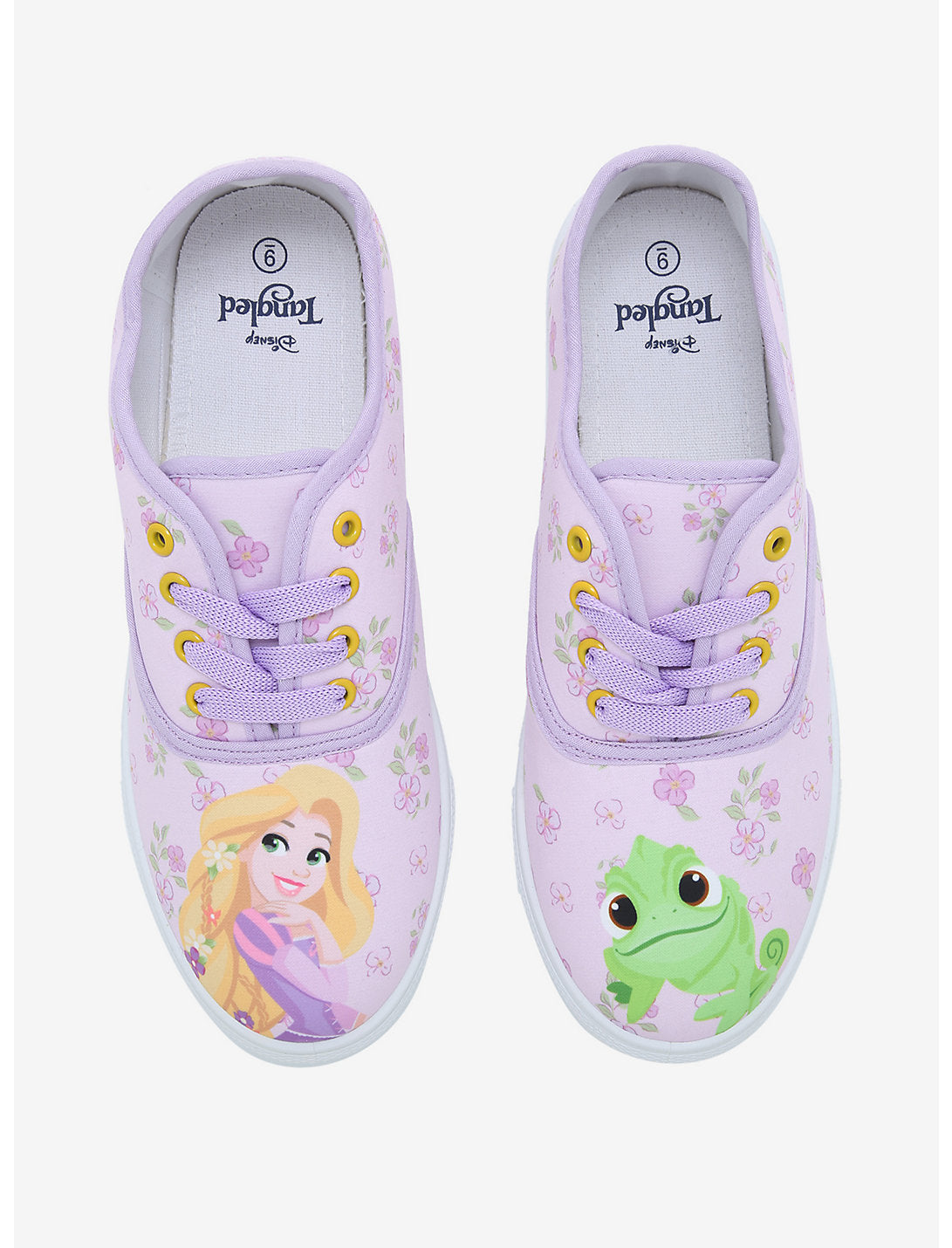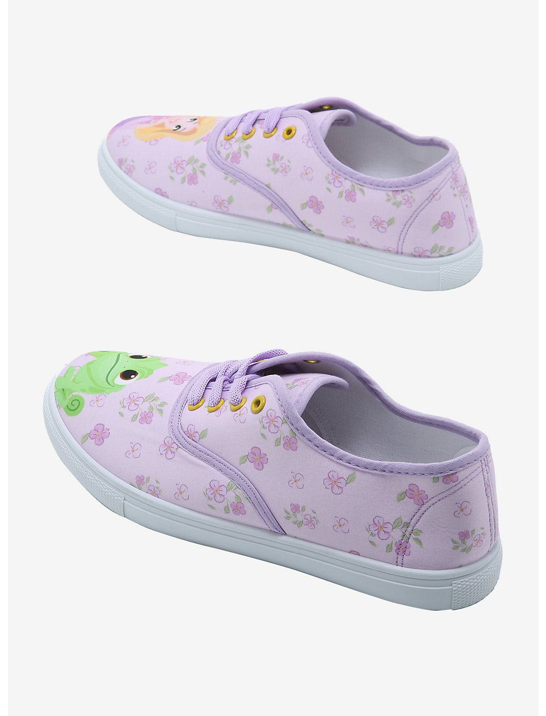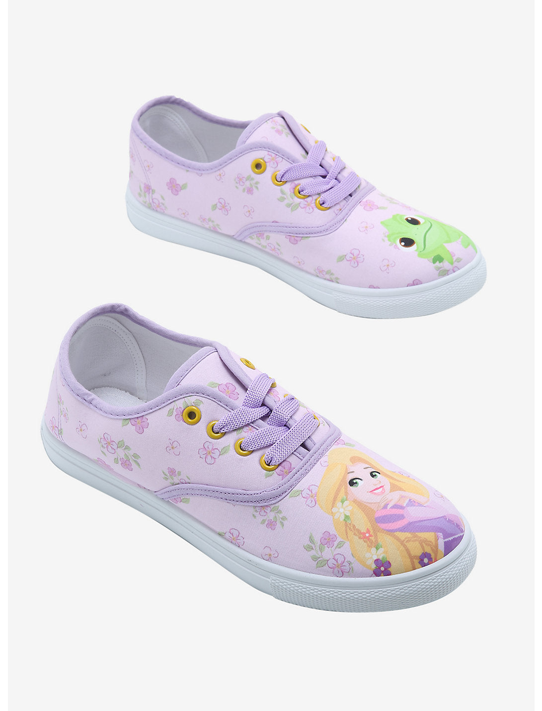 Rapunzel está celosa de todos los que están fuera de la torre porque pueden vivir sus vidas como quieren. ¡Vive tu mejor vida con estas zapatillas con cordones Tangled! Tiene un estampado floral morado y los dedos de los pies presentan a Rapunzel en uno y a su mejor amiga Pascal en el otro.