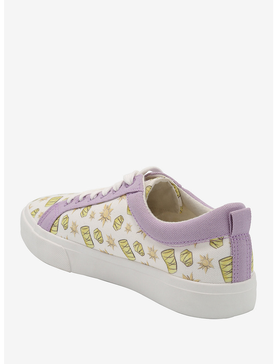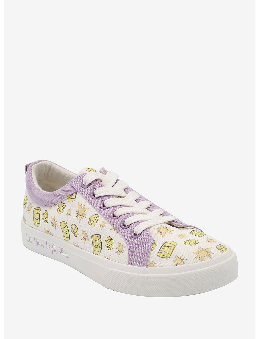 ¿Estás listo para el mejor día de tu vida? ¡Abróchate los zapatos y vámonos! Estas zapatillas de Tangled tienen un borde morado y un estampado de linternas y soles de Corona Kingdom. Hay un diseño de texto morado "Deja que tu luz brille" en las suelas y los cordones blancos.