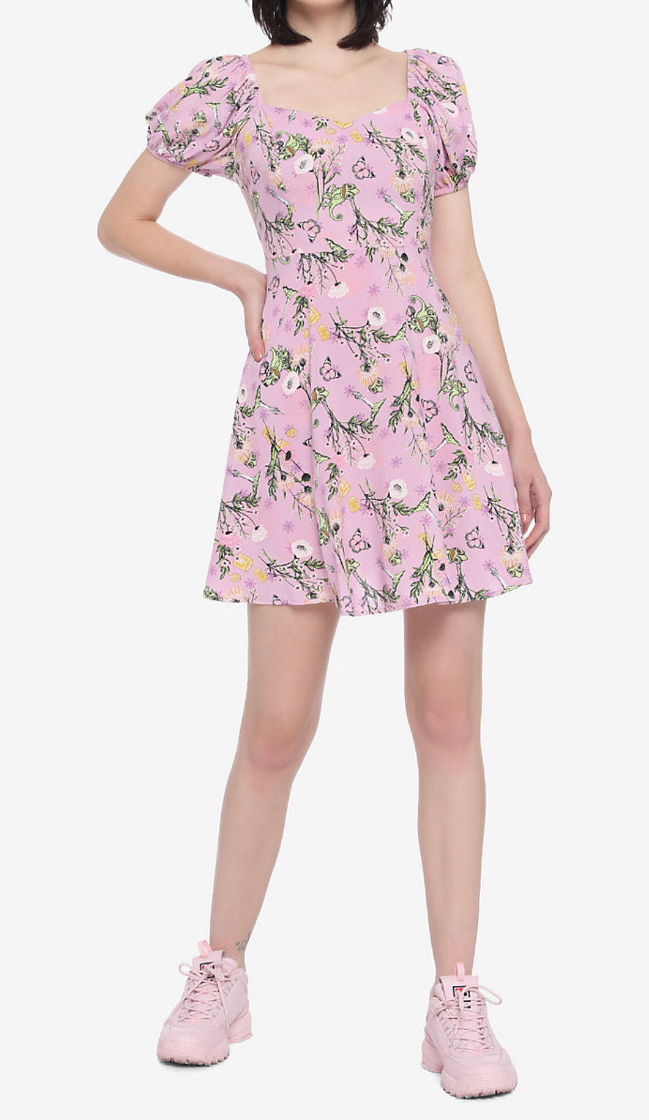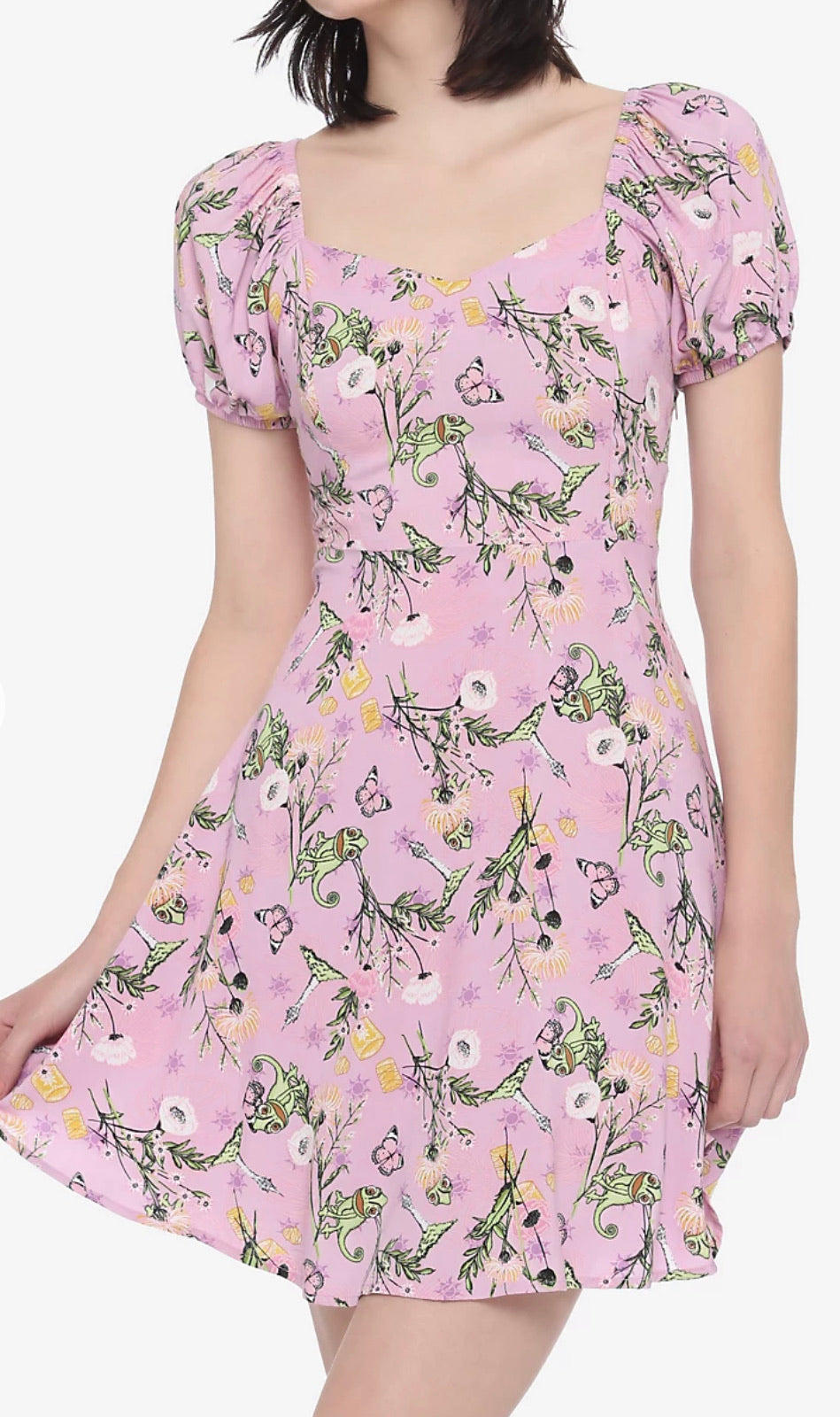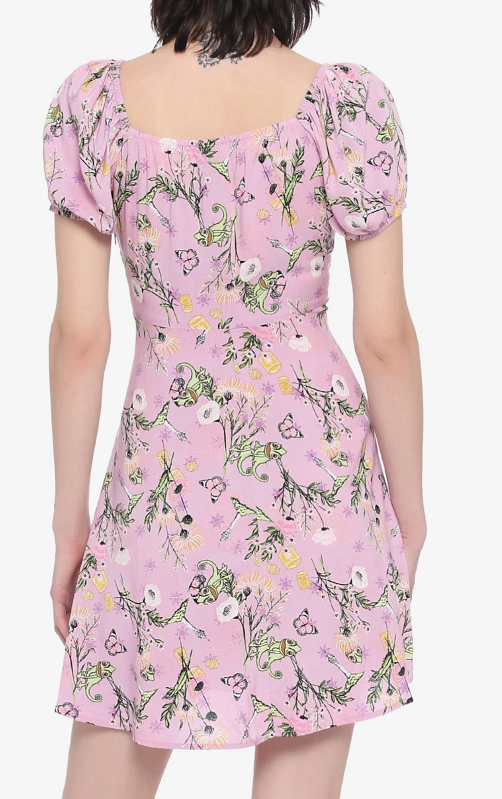 ¿Listo para el mejor día de tu vida? Este vestido de Enredados presenta un estampado integral de Pascal, flores, la torre de Rapunzel y linternas. Tiene escote corazón con mangas abullonadas con detalle de elástico. Cierre de cremallera lateral.