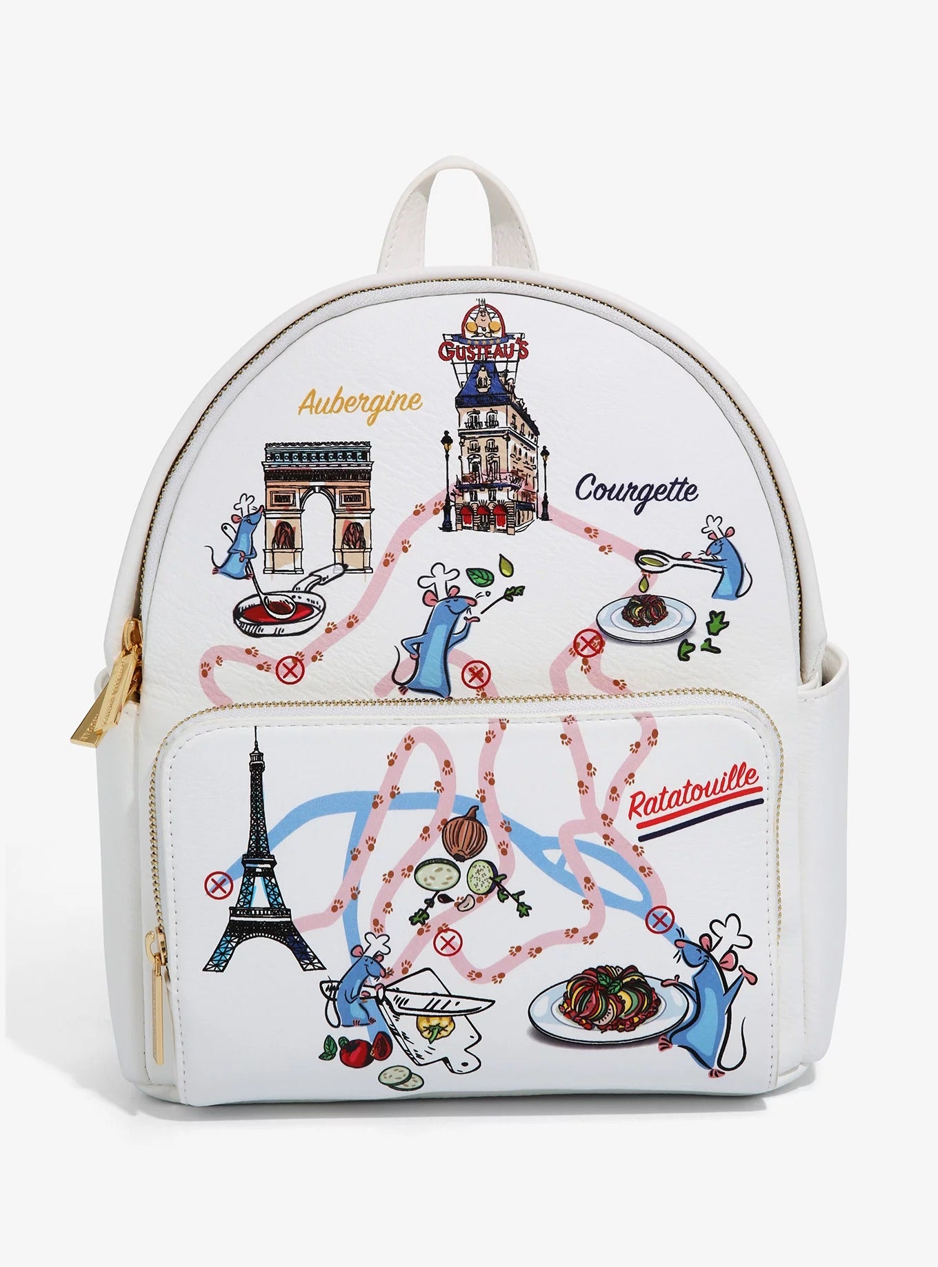 ¡Aplique sus elementos esenciales (es decir, tenedor, cuchara, cuchillo) y salga a comer con el chef de Disney • Pixar's Ratatouille! Remy no puede jugar a las escondidas cuando tienes un mapa práctico con puntos de referencia como el de Gusteau, impreso en esta mini mochila de piel sintética de Danielle Nicole.