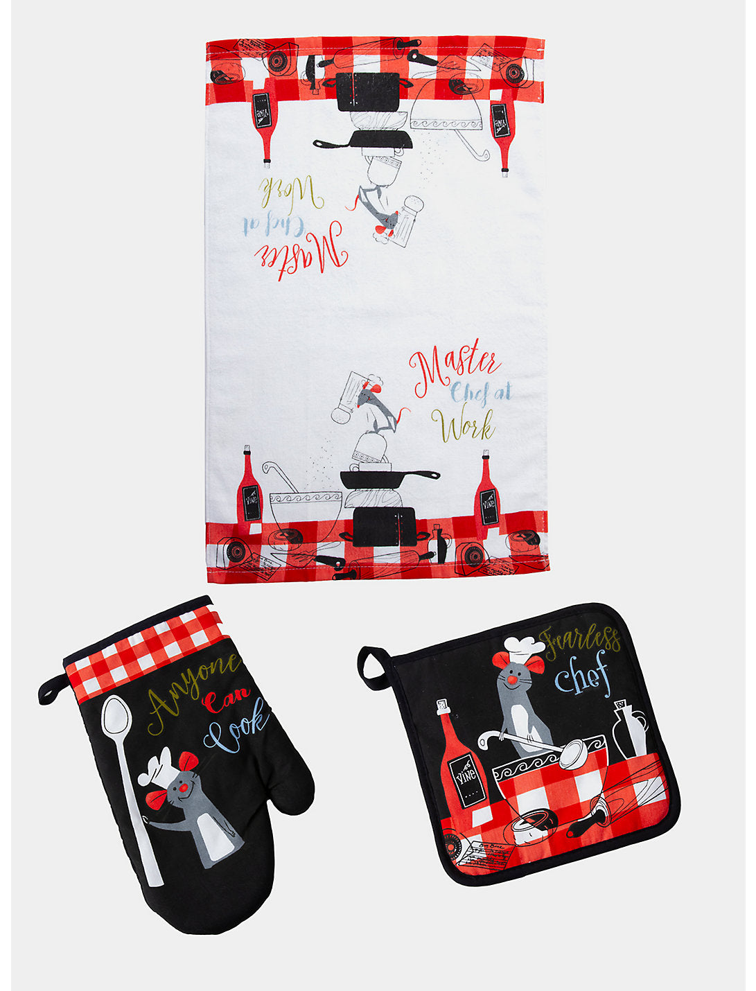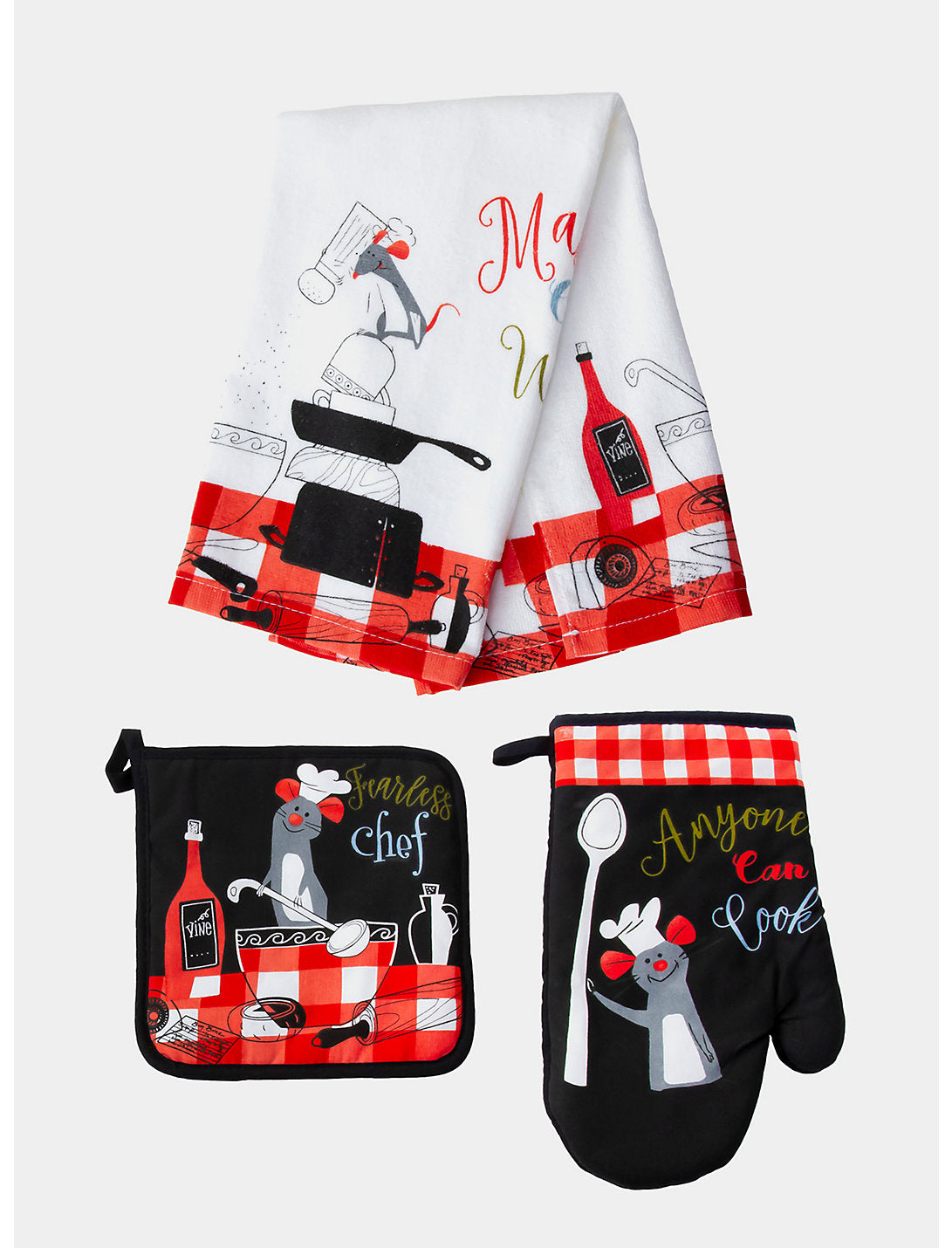 ¡Siéntete como un verdadero chef francés, con un toque rodential, usando este juego de cocina inspirado en Ratatouille de Pixar! Remy aparece en el guante de cocina y en la agarradera junto con imágenes culinarias, como botellas de vino, tazones de sopa, sartenes, cucharas y más. También incluye un paño de cocina.