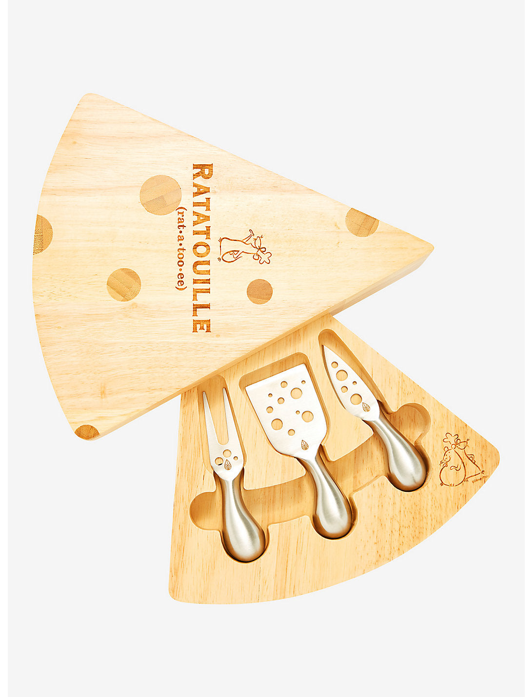 Inspirada en el clásico culinario de Disney • Pixar, esta tabla tiene la forma de un trozo de queso suizo y viene con tres herramientas para servir para que su próxima reunión sea breve.