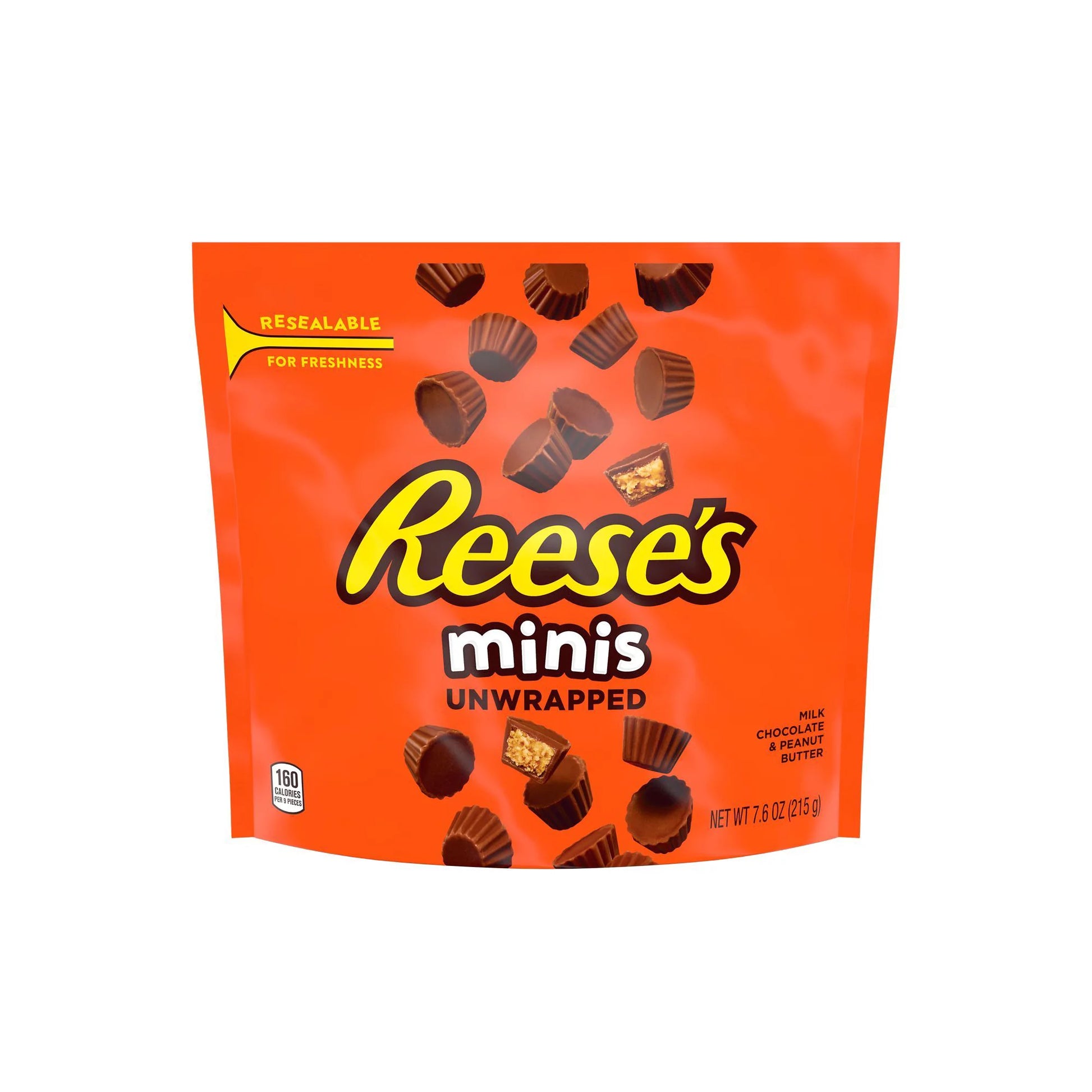 Contiene un (1) 7.6oz. paquete resellable de REESE'S Minis Milk Chocolate Peanut Butter Vasos sin envoltura Candy
