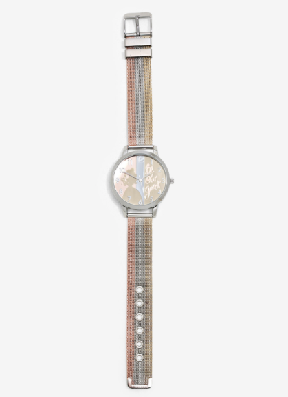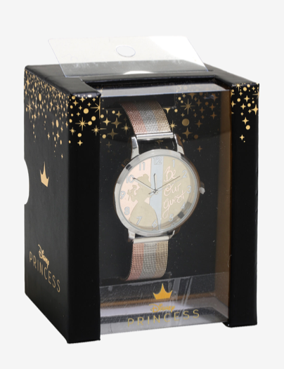 ¡La belleza se encuentra dentro y en este reloj! Tu princesa de Disney favorita, Bella, está aquí para ayudarte a controlar el tiempo. La cara tiene el diseño del texto "Sea nuestro invitado", la silueta de Belle y un fondo rayado. Cuenta con una correa de malla metálica con un diseño de rayas en tonos bronce, plateado y dorado y hebilla ajustable.