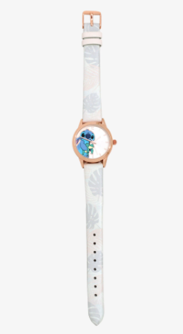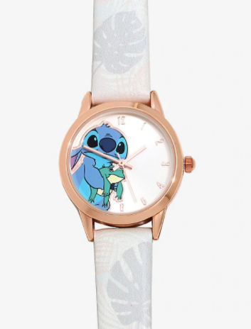 Este reloj presenta hardware de oro rosa, una correa de piel sintética con un estampado de hojas y Stitch sosteniendo una rana en la cara.