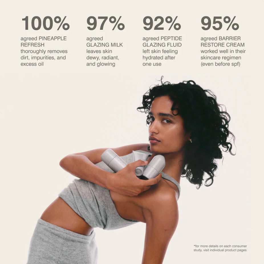 Lo que debes saber: Este kit reúne a los nuevos básicos de tu rutina: Pineapple Refresh, Glazing Milk, Peptide Glazing Fluid y Barrier Restore Cream. Cada producto está diseñado para nutrir la barrera de la piel, con texturas agradables que se integran tanto en tu cuidado facial como en tu rutina de maquillaje.
