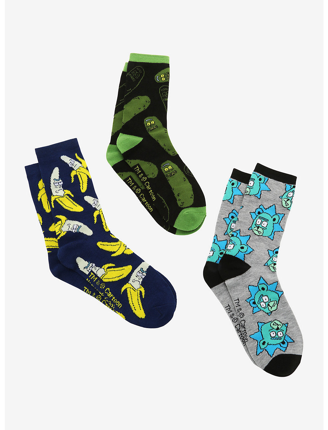Bueno, Morty, ¡son calcetines! Este juego de 3 calcetines de Rick and Morty presenta a Rick en varias formas, con una de cada una de Teddy Rick, Pickle Rick y Banana Rick.