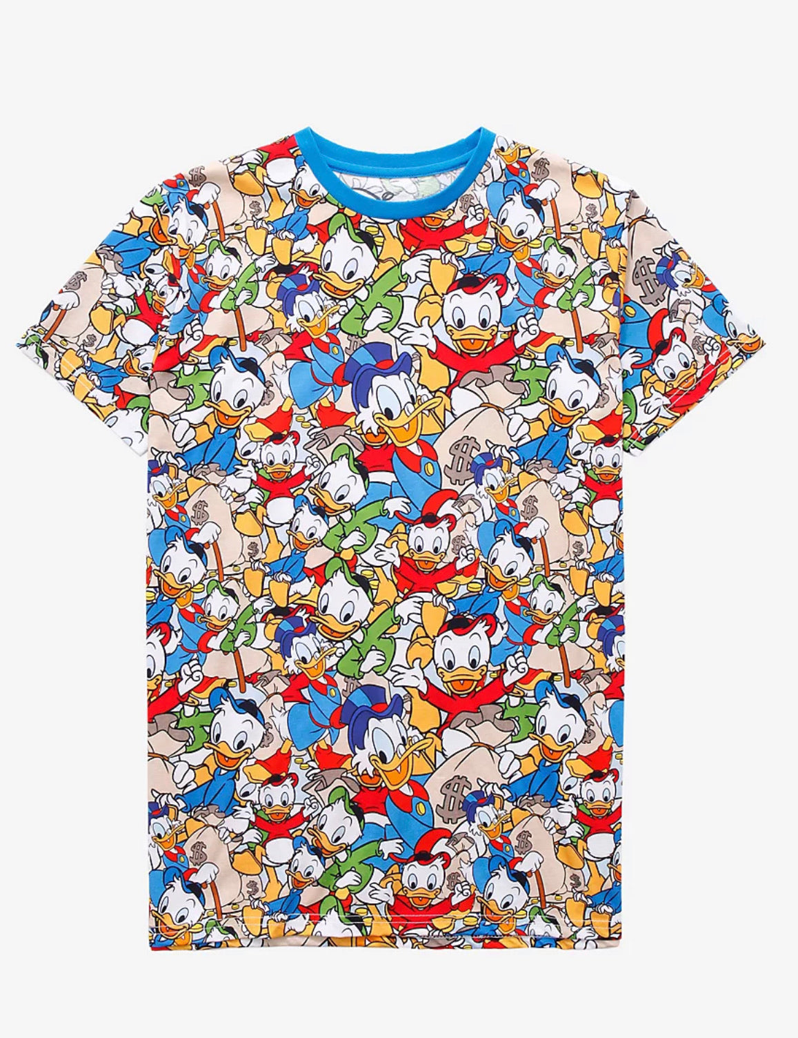 ¡Huey, Dewey, Louie y el tío Scrooge hacen un frenesí de plumas en esta camiseta de Cakeworthy! Inspirada en los dibujos animados clásicos de Disney, DuckTales, esta camiseta hará que tu rutina de atuendo habitual sea perfecta.