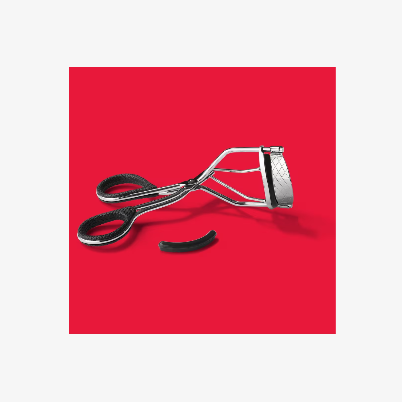 Comienza con las pestañas limpias, antes de aplicar la máscara. Coloca las almohadillas del rizador cerca de la base de las pestañas superiores y apoya la barra estabilizadora sobre tu mejilla, evitando el párpado. Aprieta suavemente (pero con firmeza) las manijas del rizador durante 5 segundos y suelta.