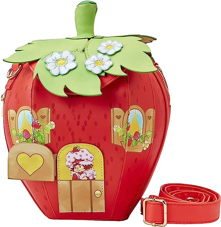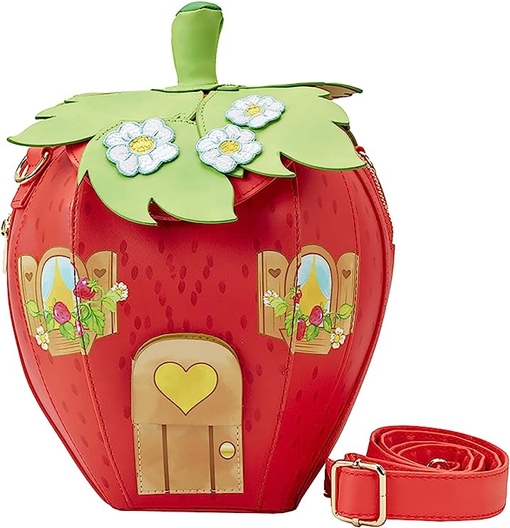 - La bolsa cruzada Loungefly Strawberry Shortcake Strawberry House está hecha de cuero vegano (poliuretano).