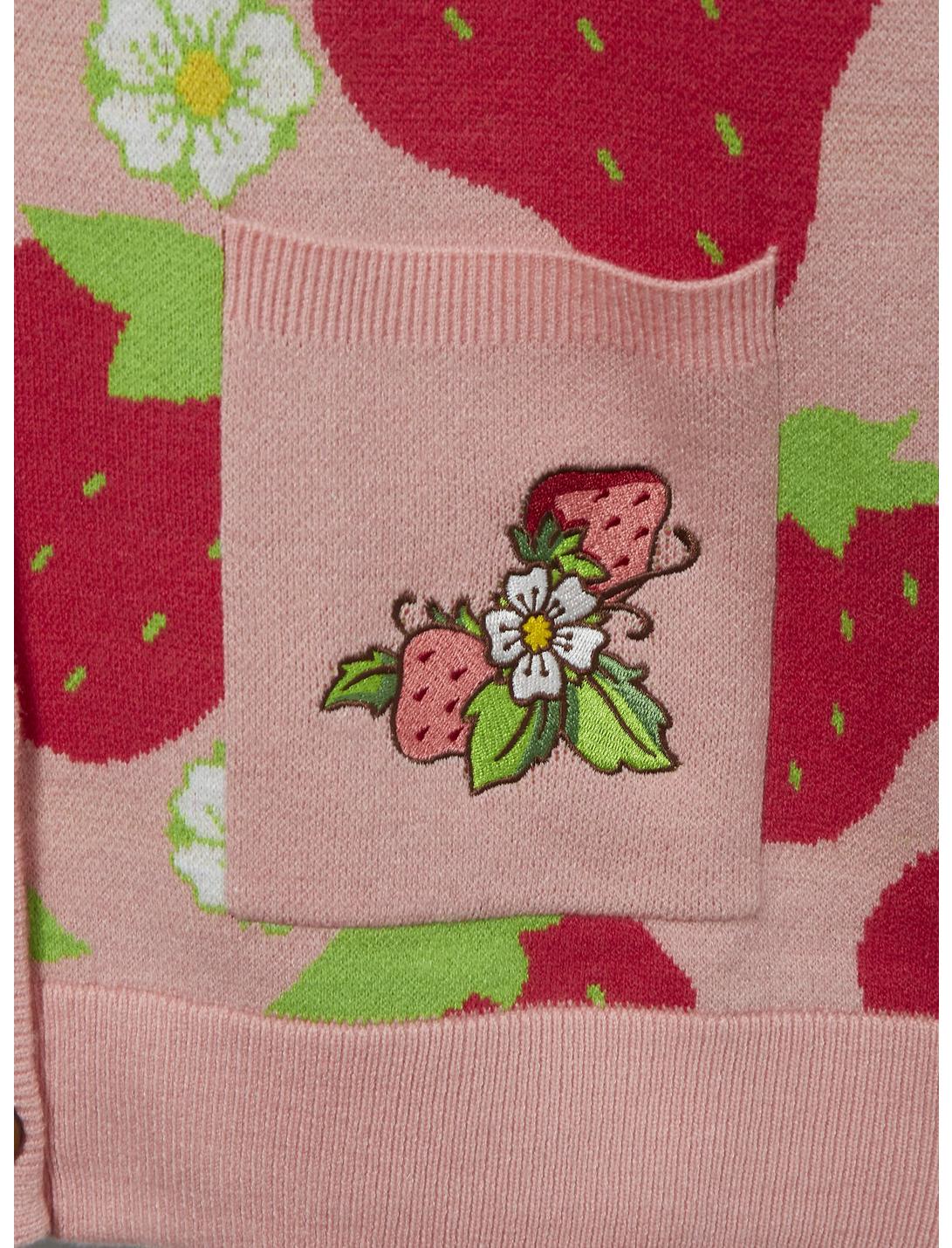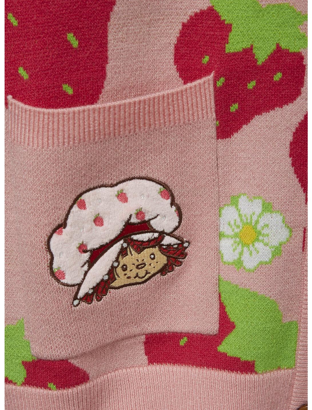 ¡Agrega un poco de dulzura a tu look con este cárdigan inspirado en Tarta de Fresa! Con un diseño integral de fresas, este suéter incluye bolsillos delanteros con diseños bordados de Tarta de Fresa y fresas y botones de madera a lo largo del frente, perfecto para abrigarse con un estilo frutal.