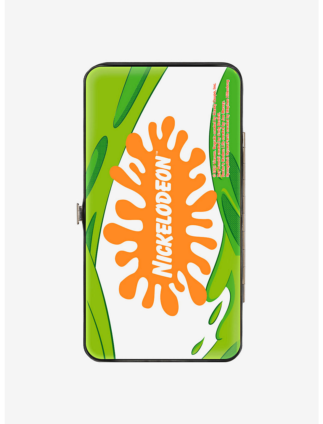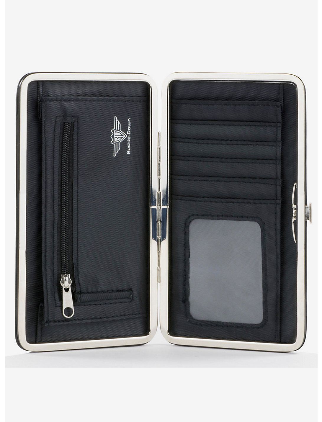 Elegante y elegante, esta billetera con bisagras está hecha de cuero vegano y acero inoxidable. Cuenta con 2 billeteras, 4 ranuras para tarjetas y un soporte para identificación con ventana.