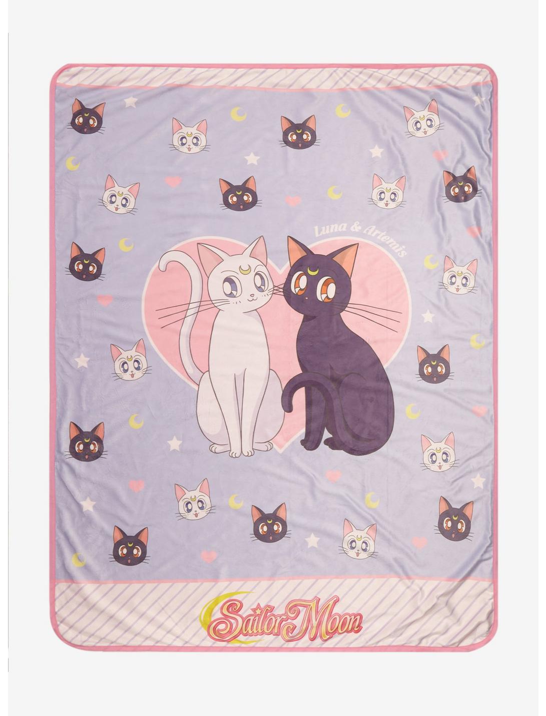¡Después de un largo día de lucha por el amor y la justicia, querrás esta manta y estos gatos mágicos para acurrucarte cuando llegues a casa! Esta manta de Sailor Moon tiene un lanzamiento completo de Luna y Artemis, además del dúo que aparece en el centro con un corazón en el fondo.
