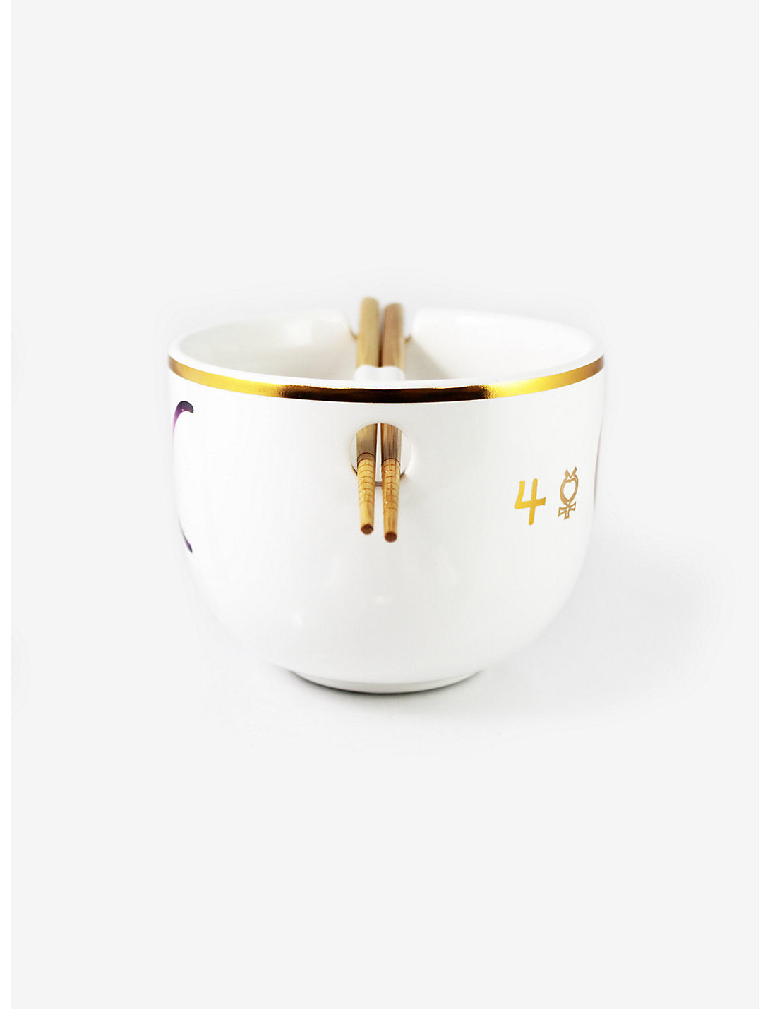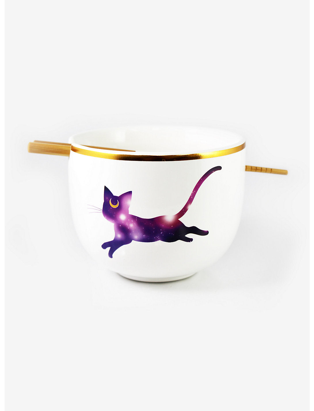 ¡El amigo de confianza de Sailor Moon está aquí para asegurarse de que tengas una comida deliciosa! Este cuenco de ramen presenta una silueta de Luna llena de galaxias con adornos dorados. Incluye dos palillos.