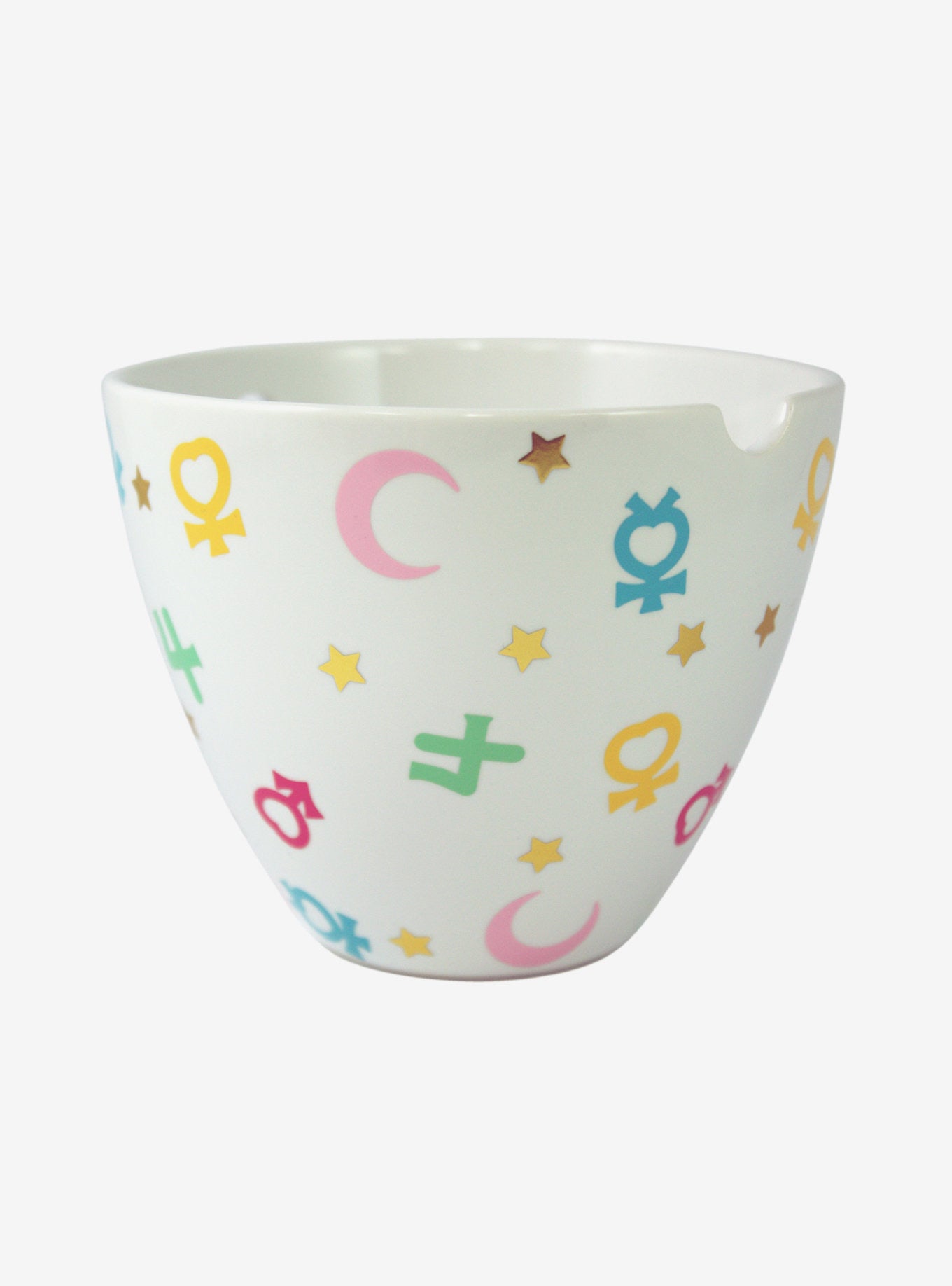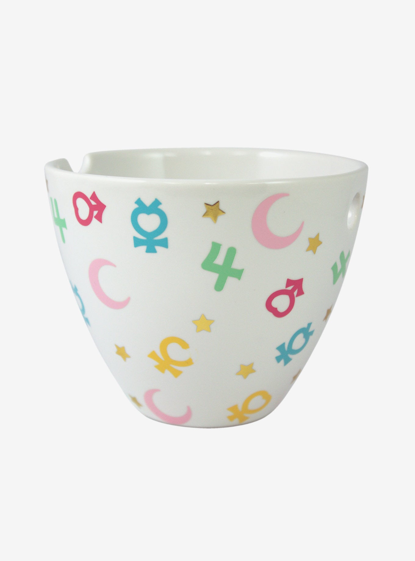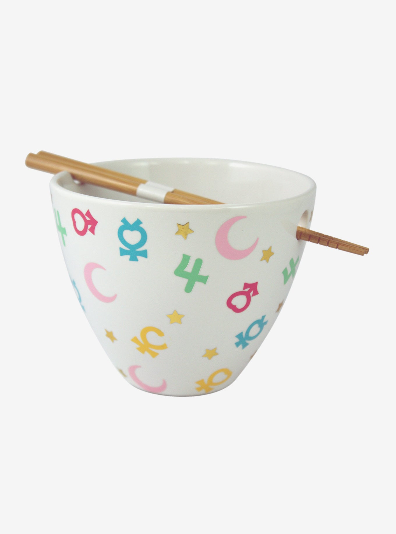 Disfruta tu ramen de forma mágica con este juego de tazón y palillos de Sailor Moon. Impreso en todo el exterior con los símbolos y estrellas de Sailor Guardian y con una ranura para sujetar los palillos.