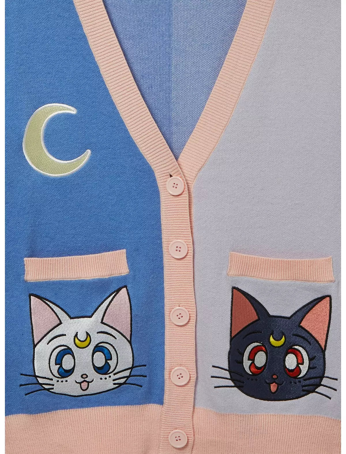 ¡Trae a tus gatos animados favoritos a tu guardarropa con este cárdigan inspirado en Pretty Guardian Sailor Moon! Con apliques bordados de Luna y Artemisa en los bolsillos delanteros, el frente también incluye un detalle de luna bordado. Con un diseño de bloques de color y botones en el frente, este suéter es perfecto para los fanáticos de los adorables gatos.