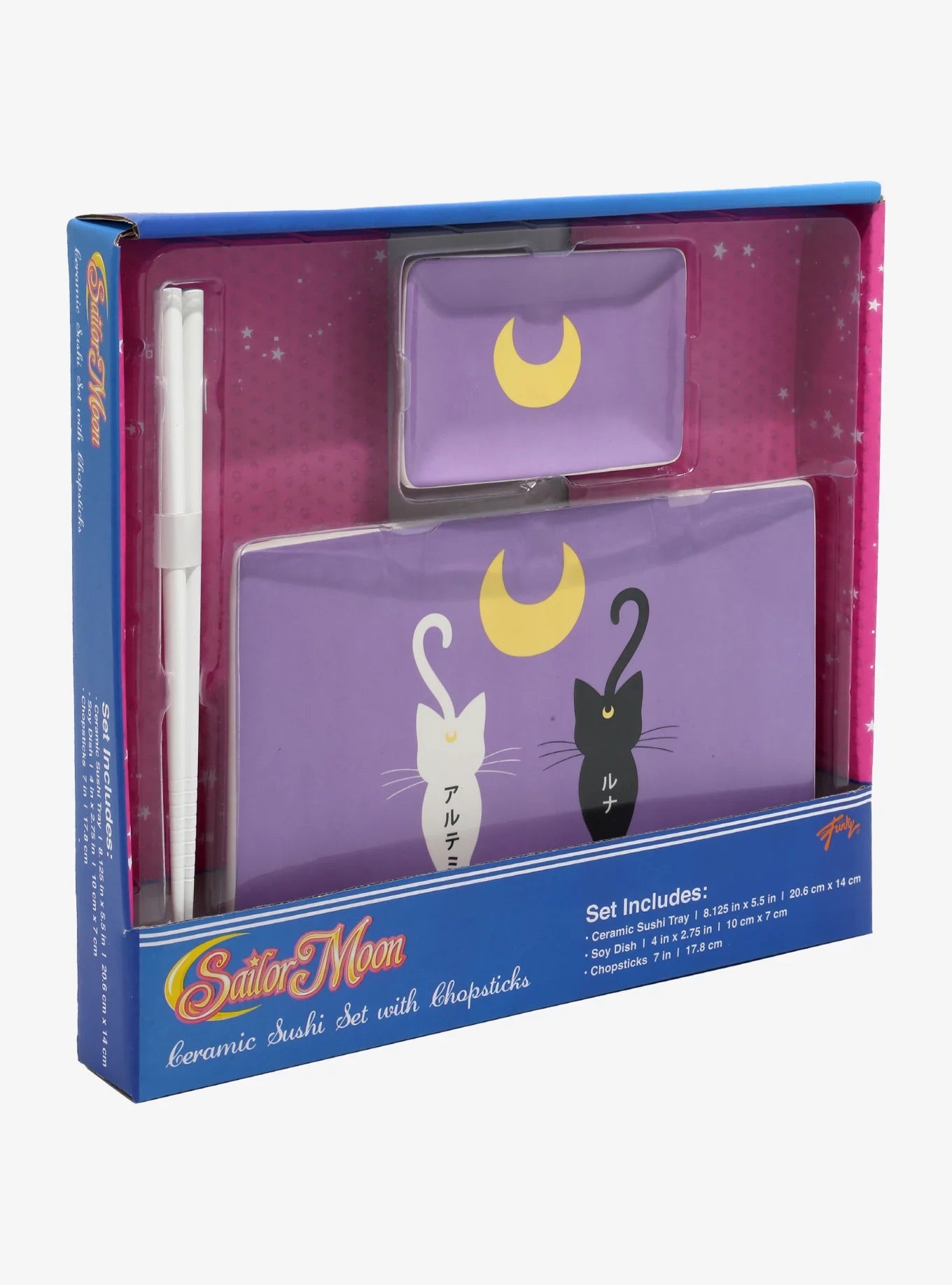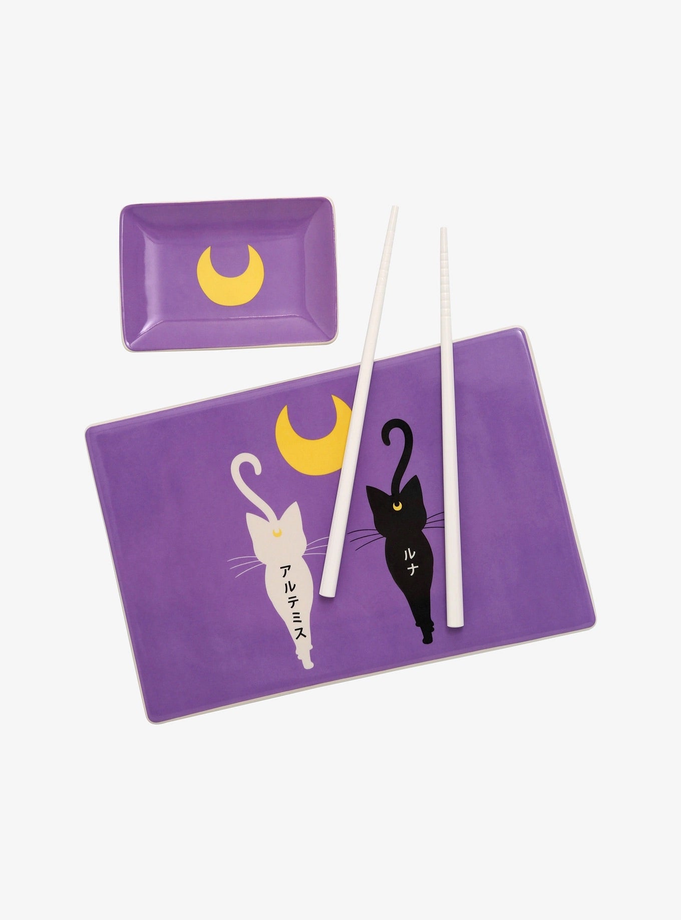 ¿Alguien con ganas de sushi? Este juego de Sailor Moon incluye una bandeja de cerámica para sushi, un plato de soja y un par de palillos. Luna y Artemis están impresos en la bandeja para servir como guardianes de todos los noms. Bandeja: 8 1/4 "x 5 1/2" Plato: 4 "x 2 3/4" Palillos: 7 "de largo Cerámica