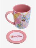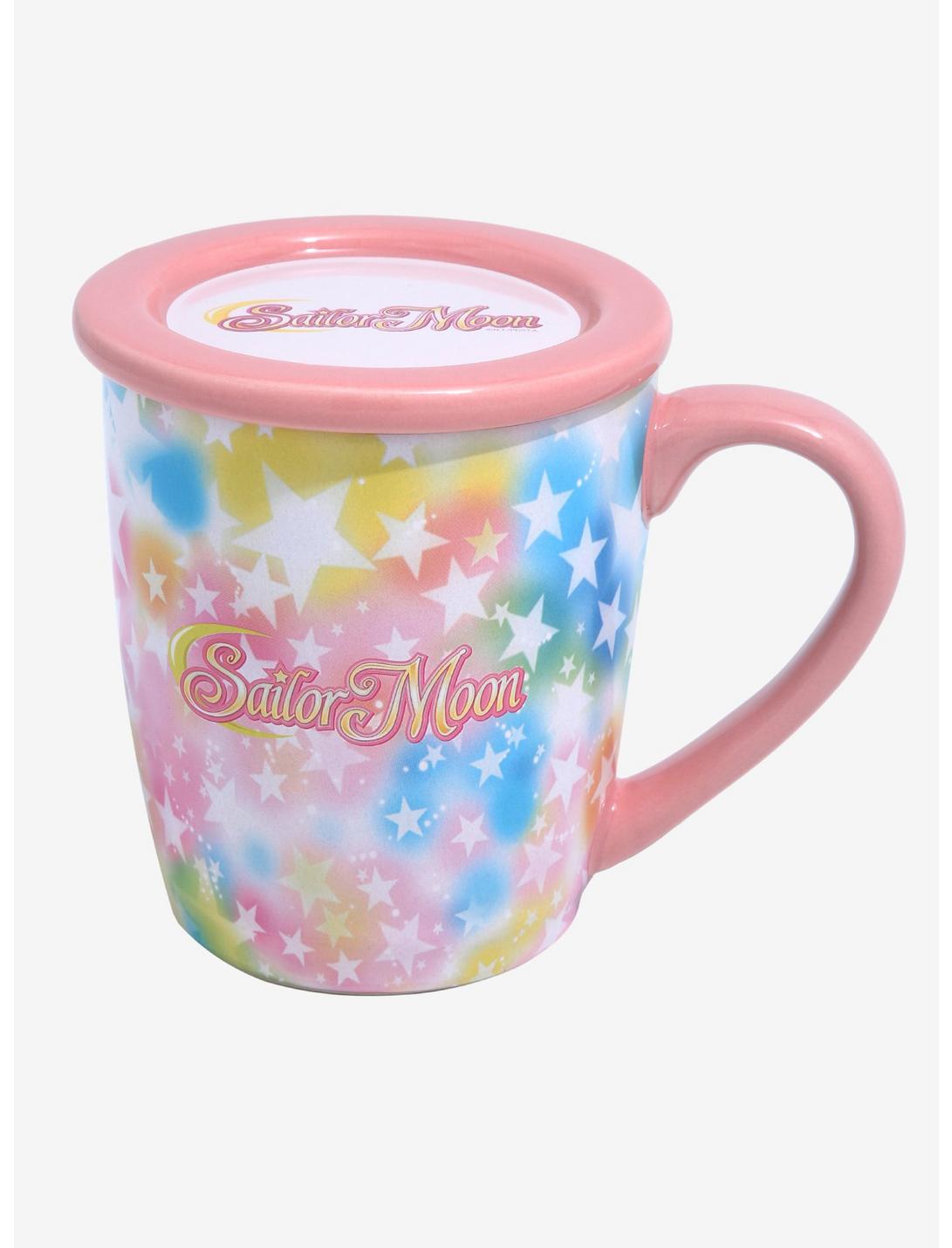 ¡Comienza tus mañanas con una taza de amor y justicia! Esta colorida taza presenta un diseño inspirado en un aerógrafo de arcoíris con estrellas por todas partes, además de tu Sailor Scout favorita: ¡Sailor Moon! Viene con un posavasos que también sirve como tapa.