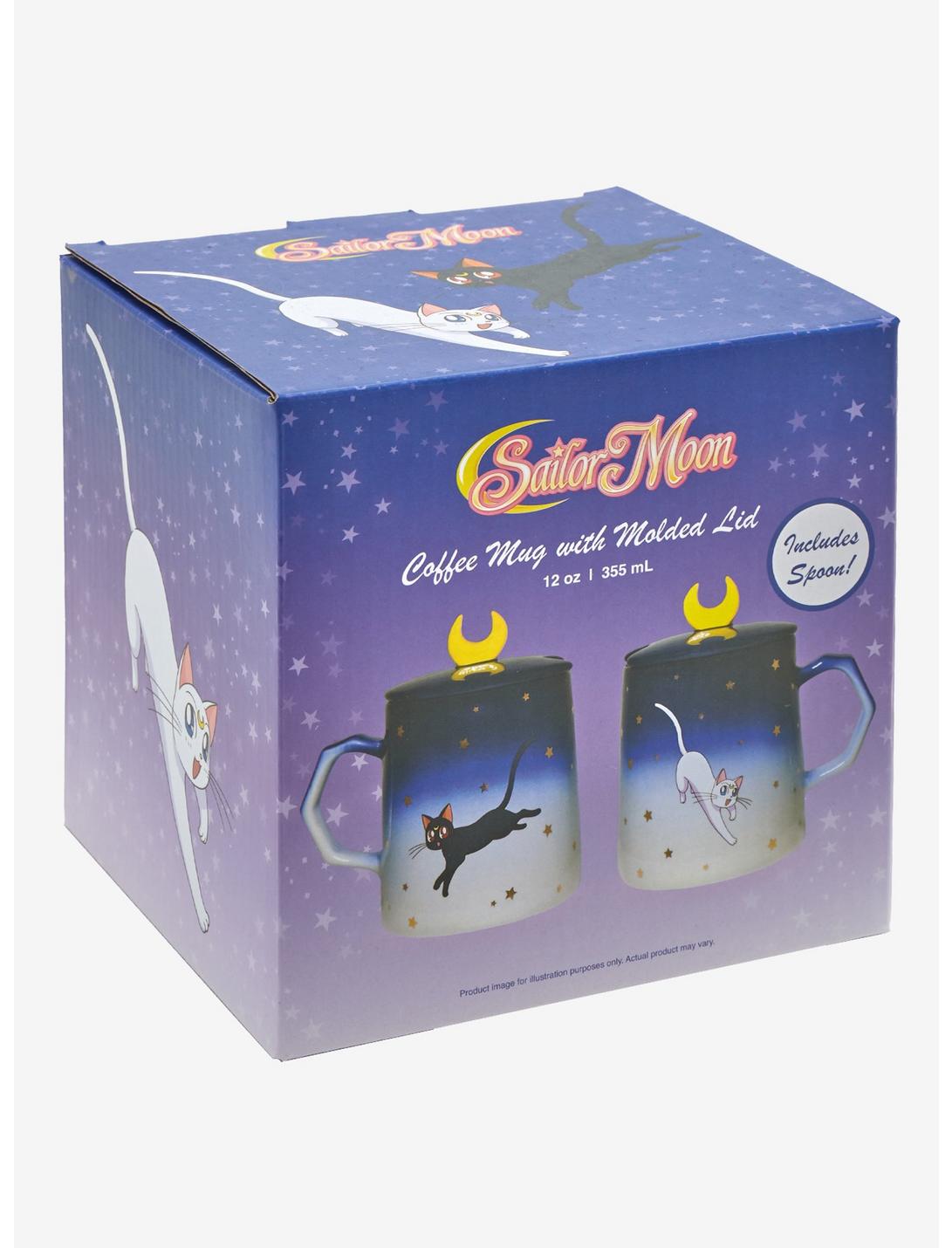 ¡Relájate después de un día defendiendo el universo con esta taza inspirada en Sailor Moon! Con diseños de Luna y Artemisa entre estrellas doradas, esta taza incluye una tapa con una luna en 3D en la parte superior y un espacio para la cuchara incluida. Este set de bebidas incluye todo para disfrutar de tu bebida caliente favorita con tus gatos mágicos favoritos.
