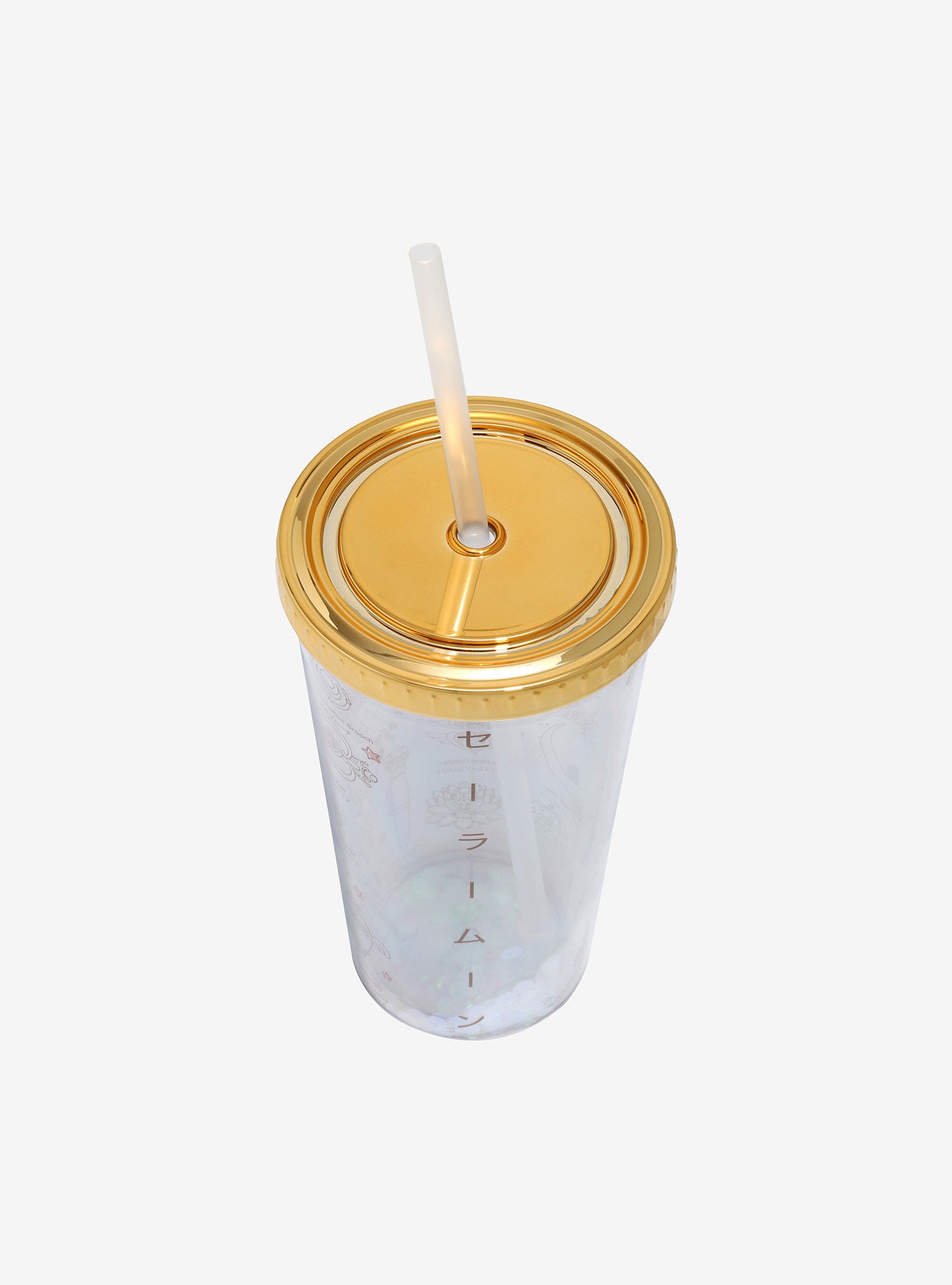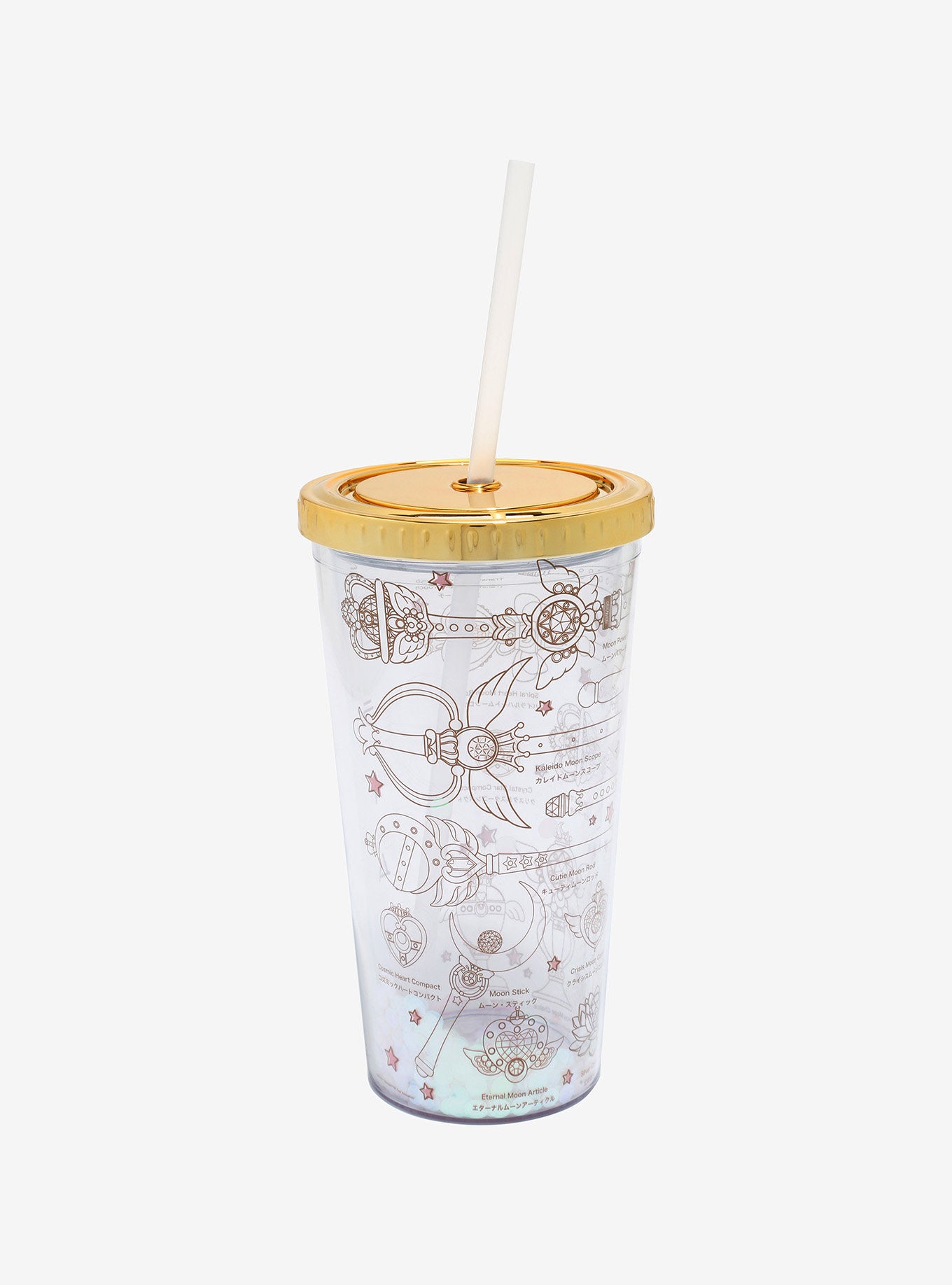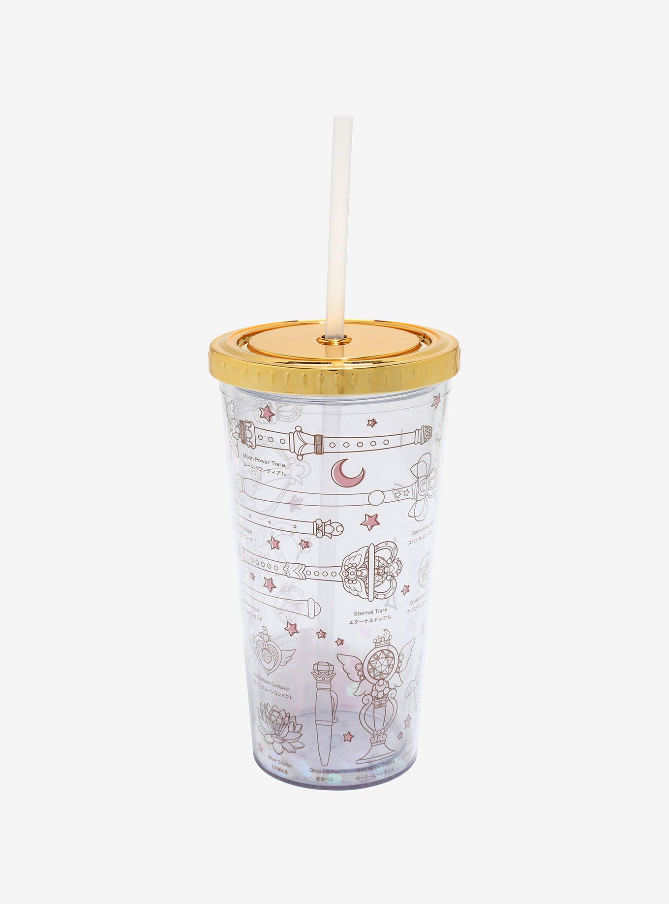 Elige tu arma para vencer la deshidratación. ¡Esta taza de viaje de acrílico de Sailor Moon cuenta con confeti iridiscente flotante libre y diferentes armas como Moon Stick, Cutie Moon Rod, Cosmic Heart Compact y más! Tapa dorada giratoria y pajita transparente reutilizable. Plástico sin BPA Solo lavar a mano No usar microondas