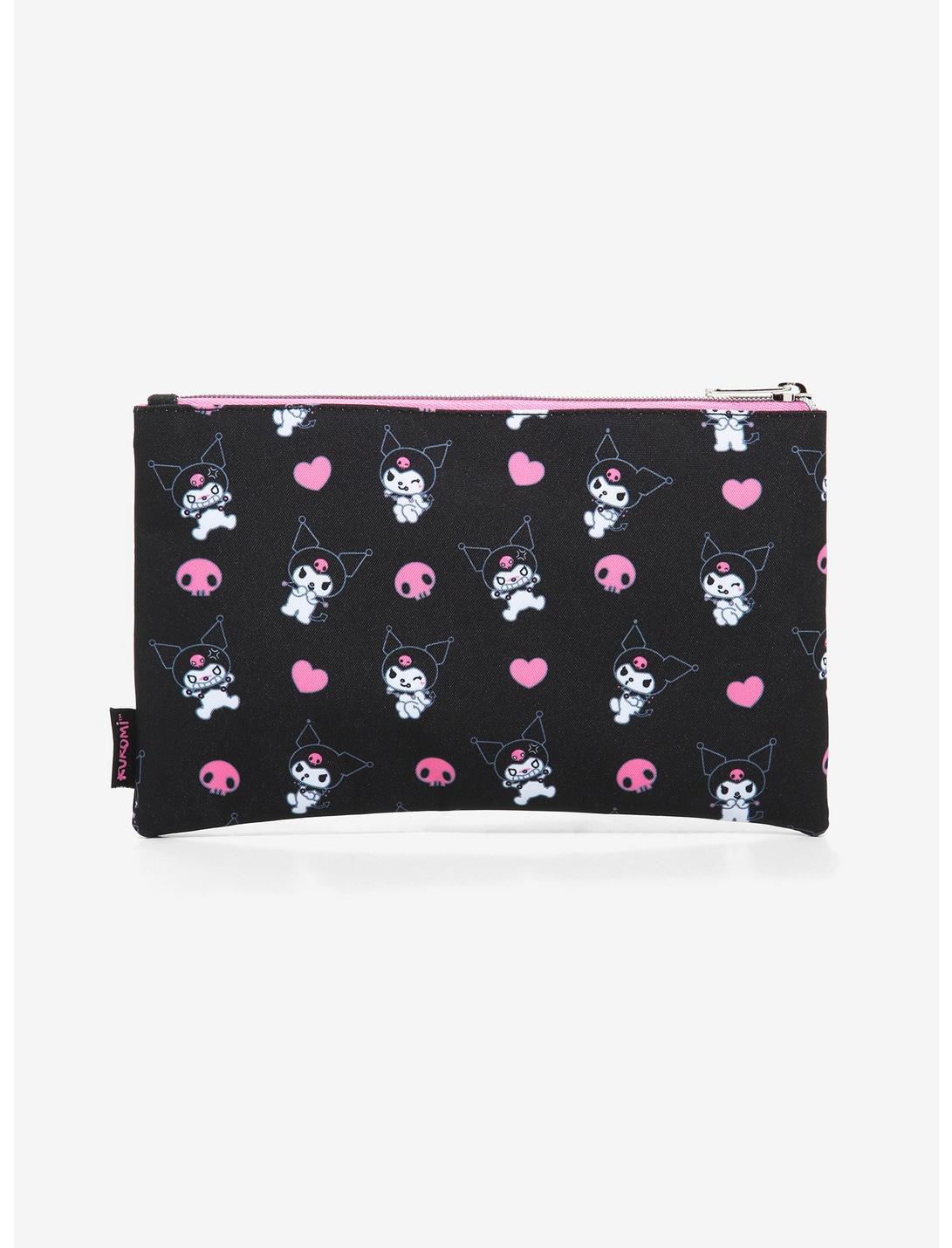 ¡Luce tan lindo como Kuromi donde quiera que vayas con esta bolsa de maquillaje! Este bolso presenta un estampado integral de su característica calavera rosa, corazones y Kuromi en diferentes poses. Cierre de cremallera superior y herrajes plateados.