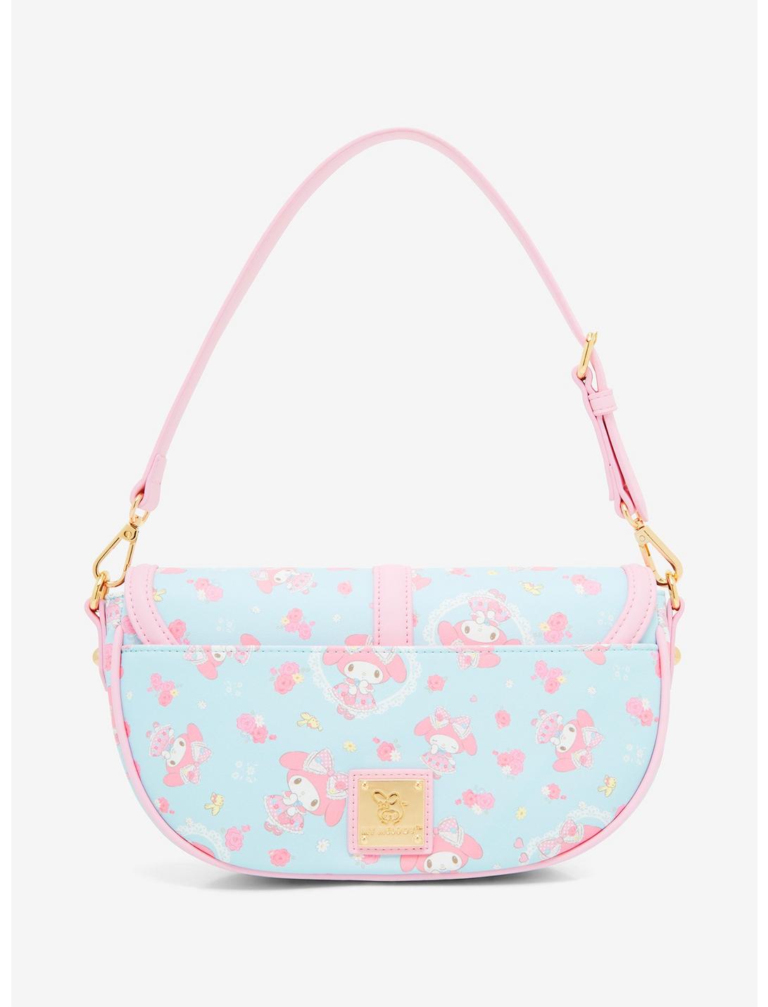¡Agrega un estilo adorable de Sanrio a tu colección de accesorios con este bolso inspirado en My Melody! Este bolso, que presenta un estampado integral de My Melody y corazones, incluye un dije de corazón de metal en la solapa frontal. Con cierre magnético y correas para hombro y bandolera extraíbles, este bolso es perfecto para las fans del conejito.