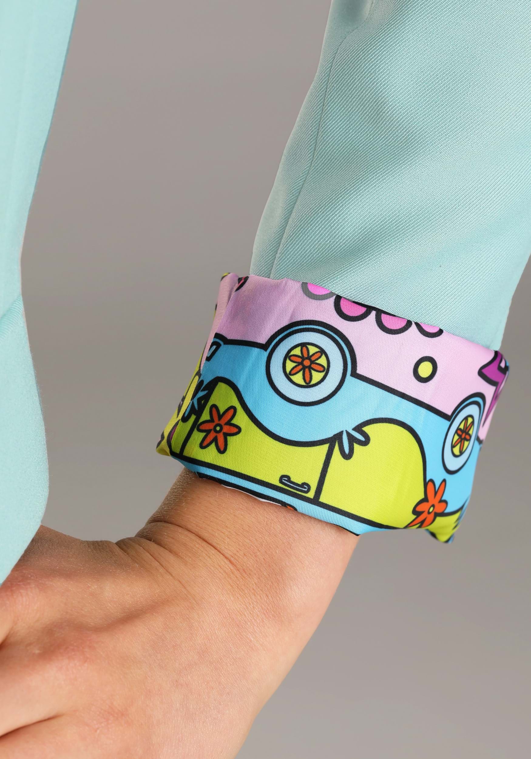 ¿Por qué nos encanta este blazer de Scooby-Doo? ¡No es ningún misterio! ¡Este blazer es de un azul precioso con un forro de patrón disperso único que parece sacado directamente de los años sesenta! Póntelo y sentirás que tienes lo que se necesita para armar tu propio equipo misterioso. ¿Qué le impide comprar su propio VW Bus personalizado y rastrear engaños elaborados en su propia comunidad? Ciertamente no puedes culpar a tu guardarropa una vez que este blazer llegue a tu puerta. Aprobado por todos los agentes de Mystery Incorporated, seguramente encontrará una excusa para ponerse esta chaqueta al menos una vez a la semana.