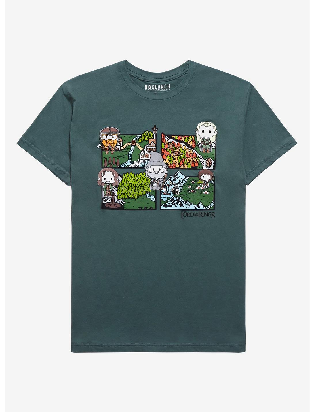 ¡Viaja por las tierras de la Tierra Media con tus amigos favoritos de El Señor de los Anillos y esta cómoda camiseta! Gimli, Legolas, Gandalf, Aragorn y Frodo aparecen como adorables retratos de chibi mientras atraviesan sus aventuras en el frente de este estilo de fantasía.
